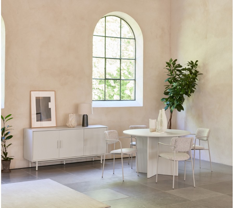 Příborník Hvidea je ideálním doplňkem do moderních jídelen laděných v přírodních zemitých tónech, kde přinese zajímavou strukturu a podtrhne elegantní minimalistický vizuál. Skvěle vynikne také v interiérech v art deco stylu, například v kombinaci s mramorovým stolem, barevnými sametovými židlemi nebo kovovými doplňky ve zlatém provedení. Prostor výborně doplní i další modely ze stejné kolekce Hvidea.
