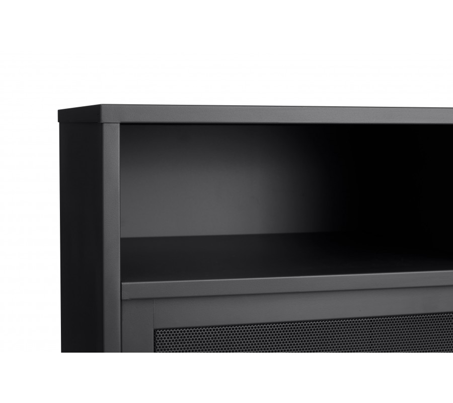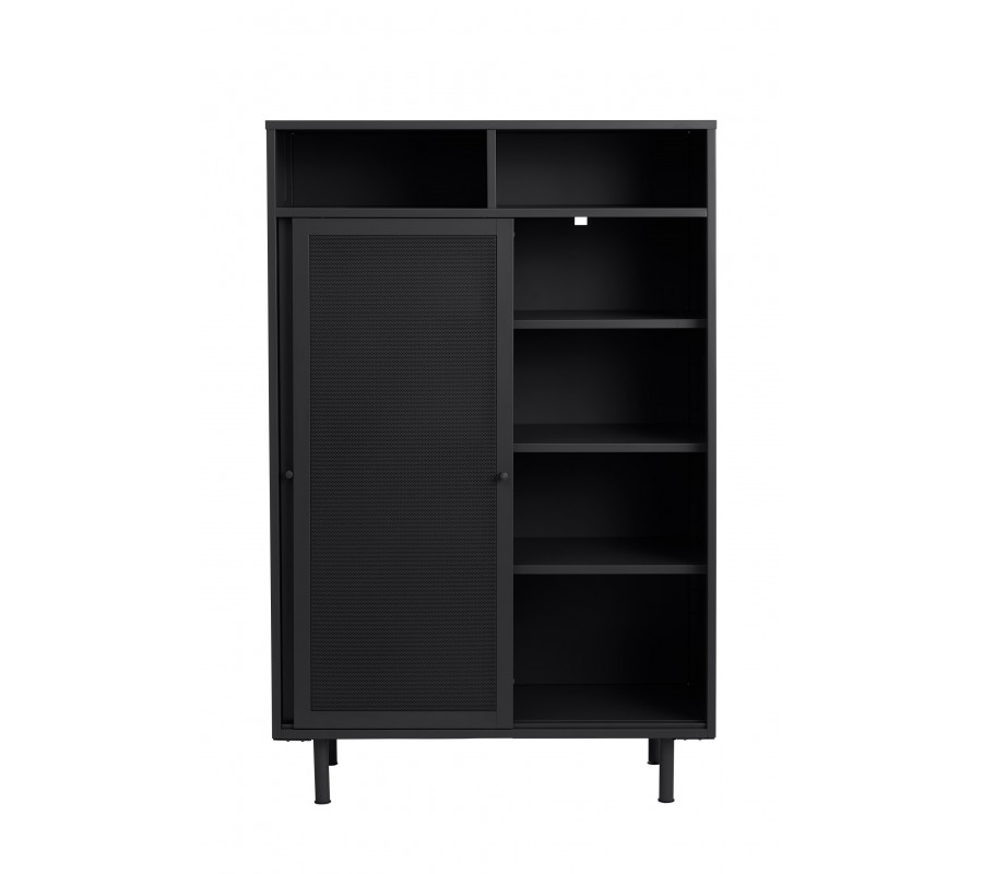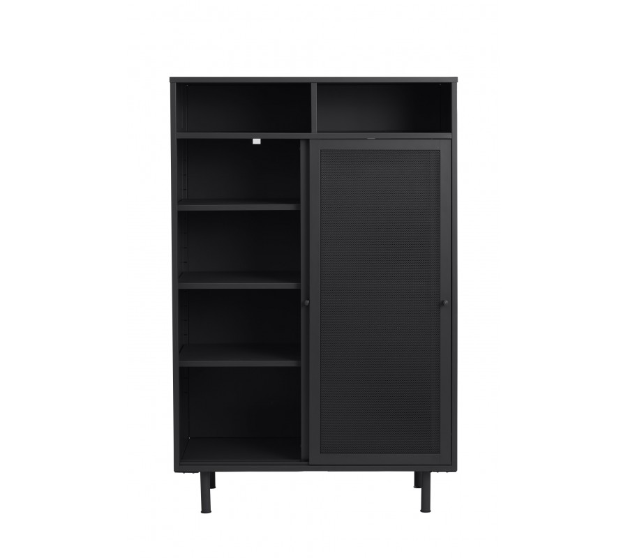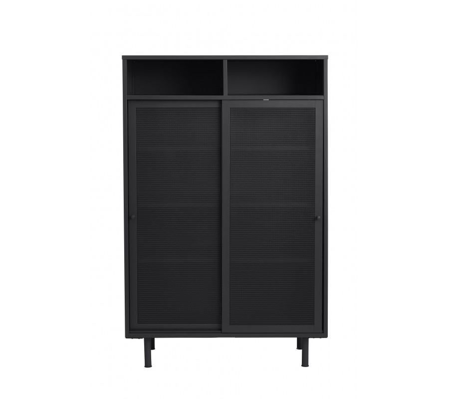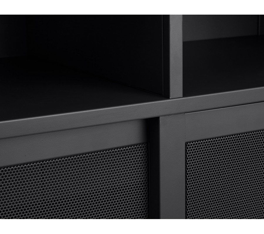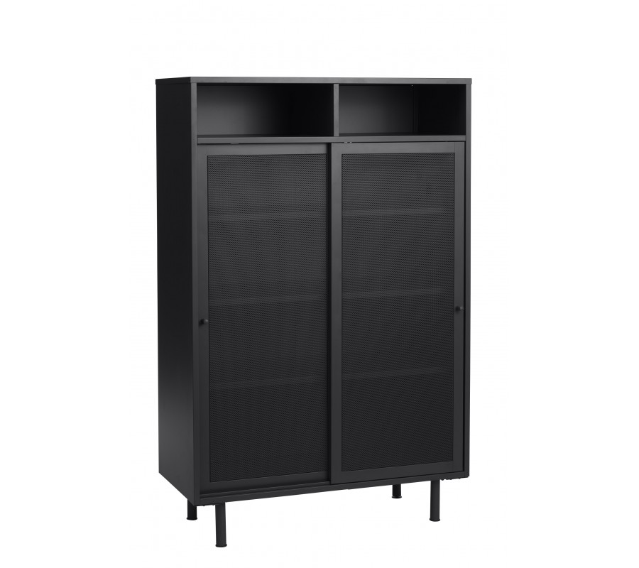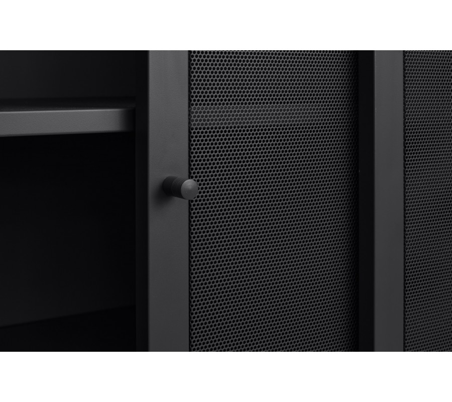 Industriální vysoký příborník Vejle z kovu v černé barvě s policemi a dvěma posuvnými perforovanými dvířky 140 cm