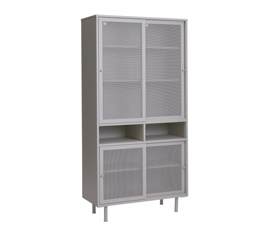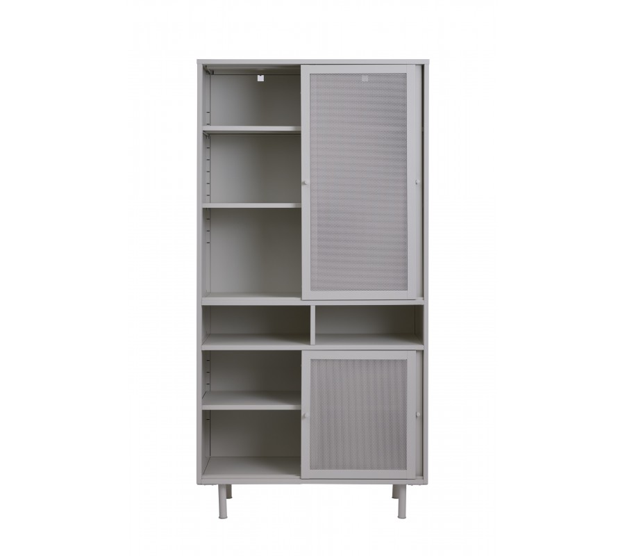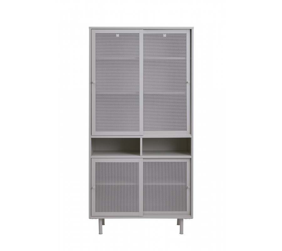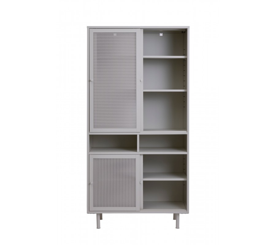 Moderní kovový vysoký příborník Vejle s perforovanými posuvnými dvířky a policemi v šedobéžovém odstínu greige 180 cm
