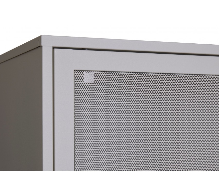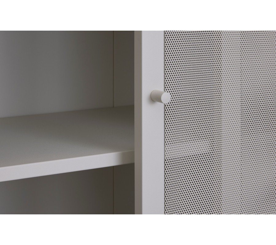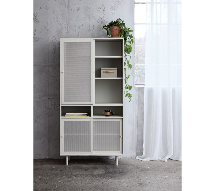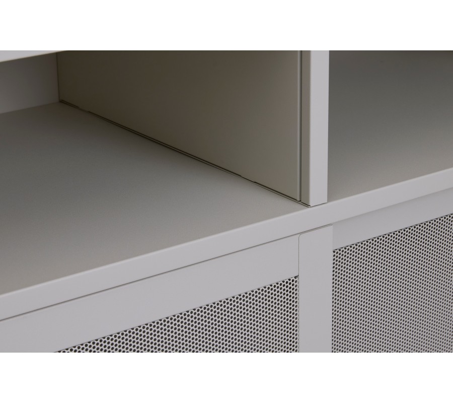 Příborník je vyroben z kovu, který mu dodává industriální výraz. Zjemňuje jej matná povrchová úprava ve světlém odstínu greige, kombinující šedou a béžovou barvu. Zvýrazňuje jeho neutrální minimalistický vzhled a snadno se kombinuje s dalším nábytkem.