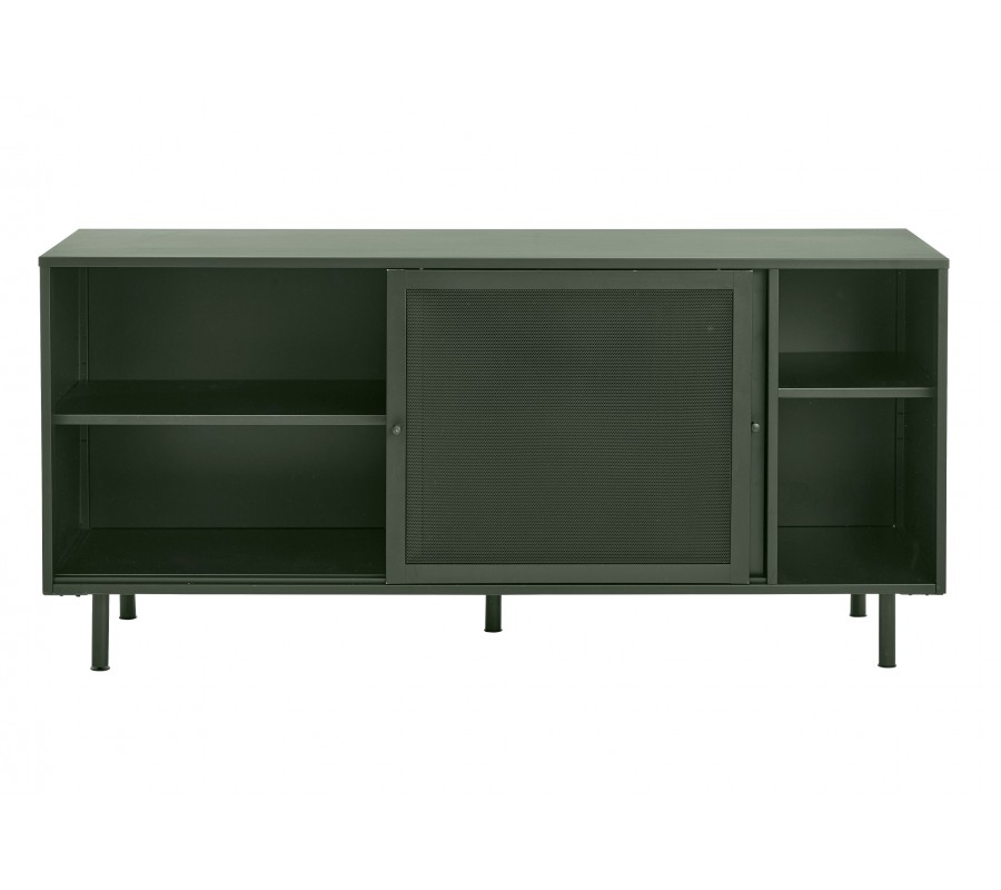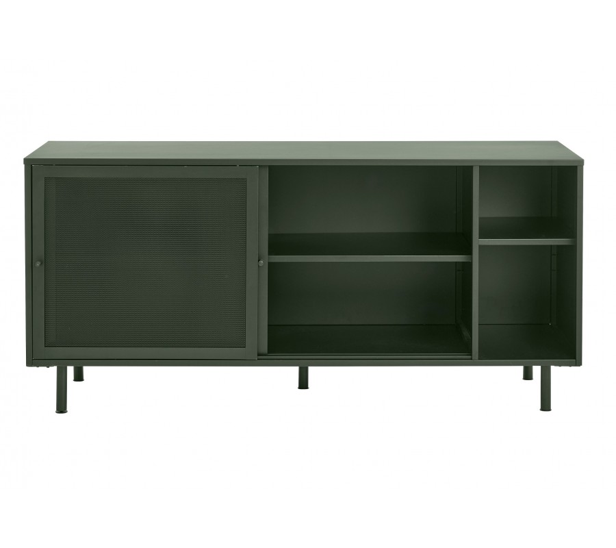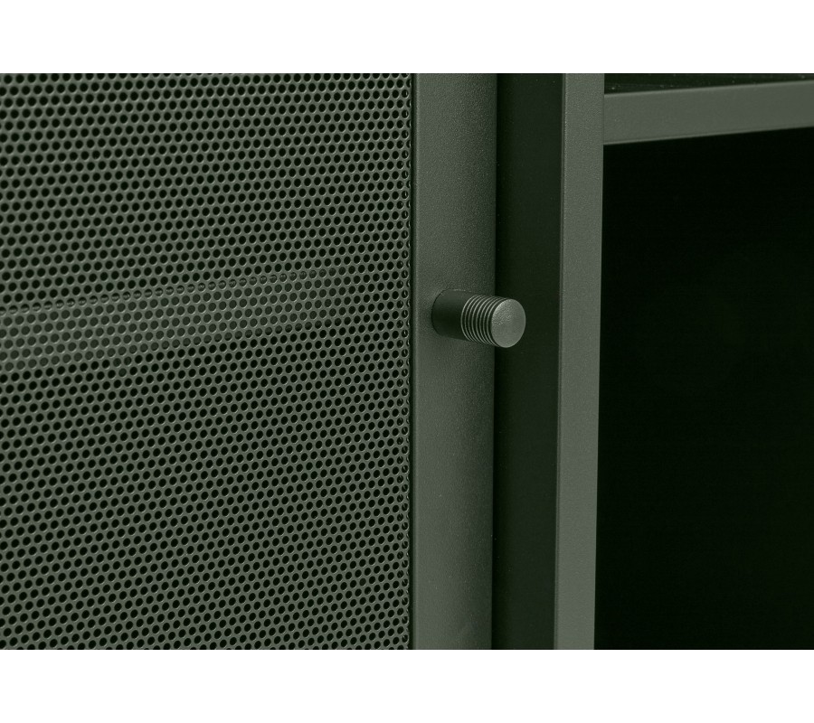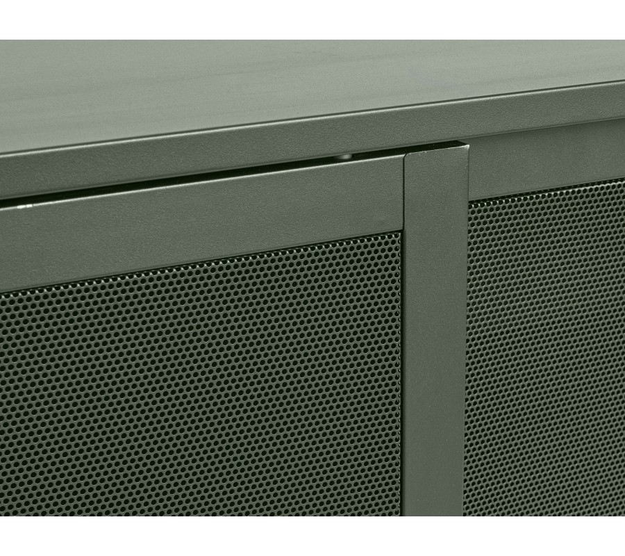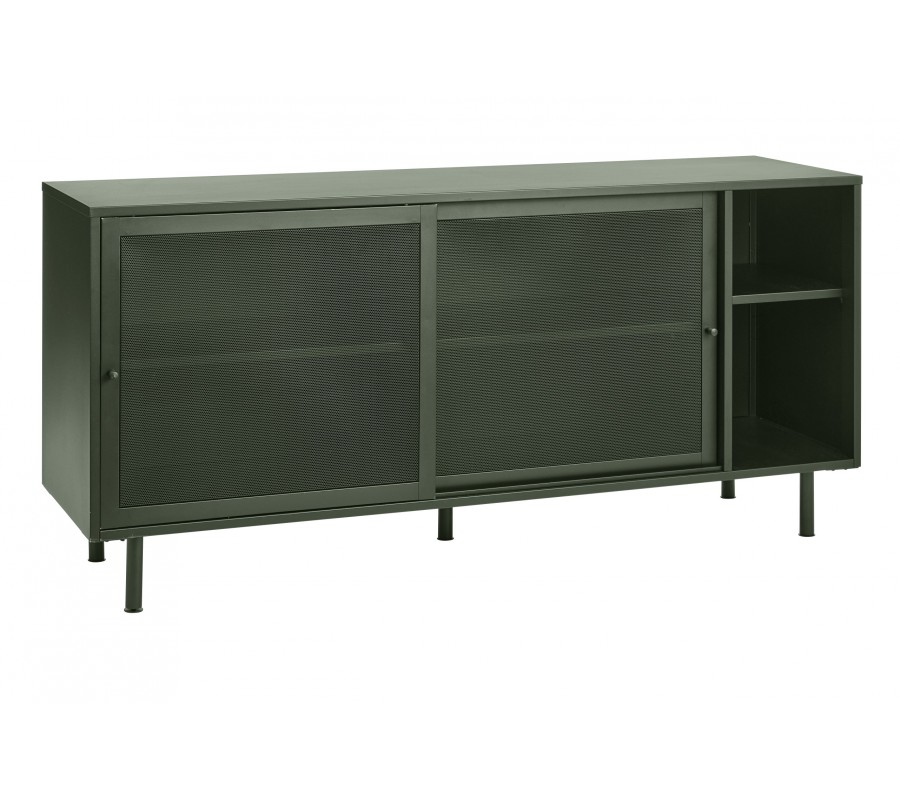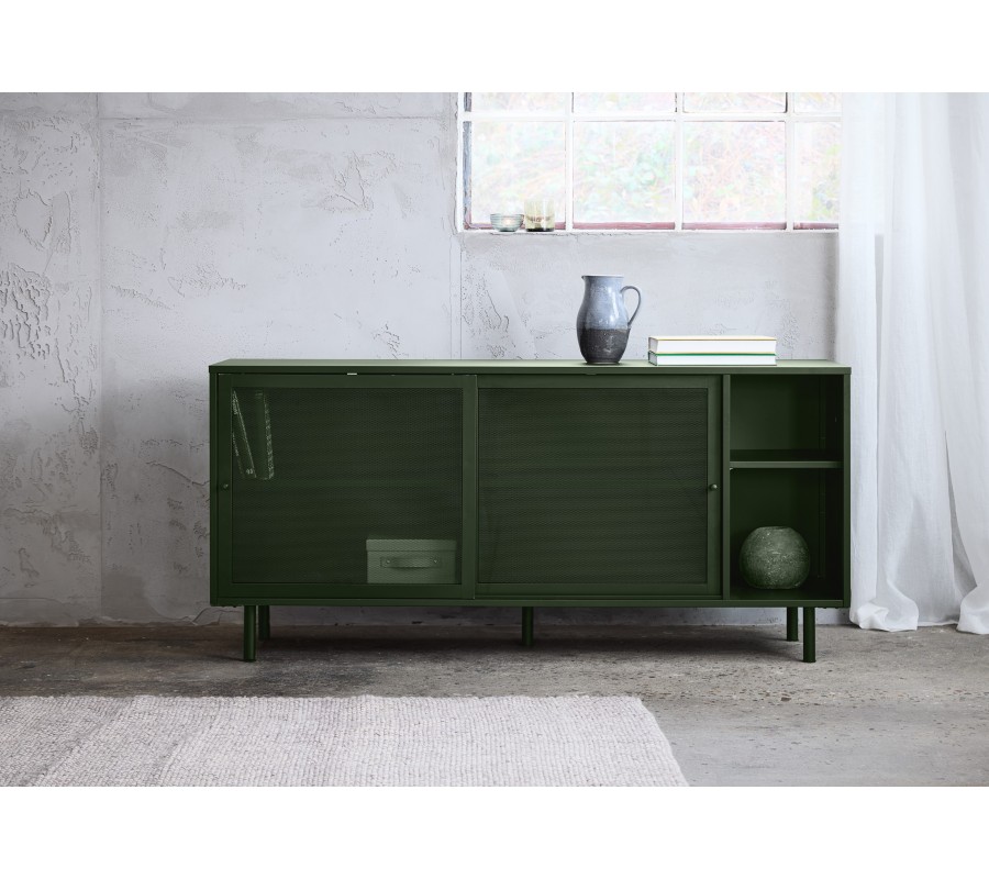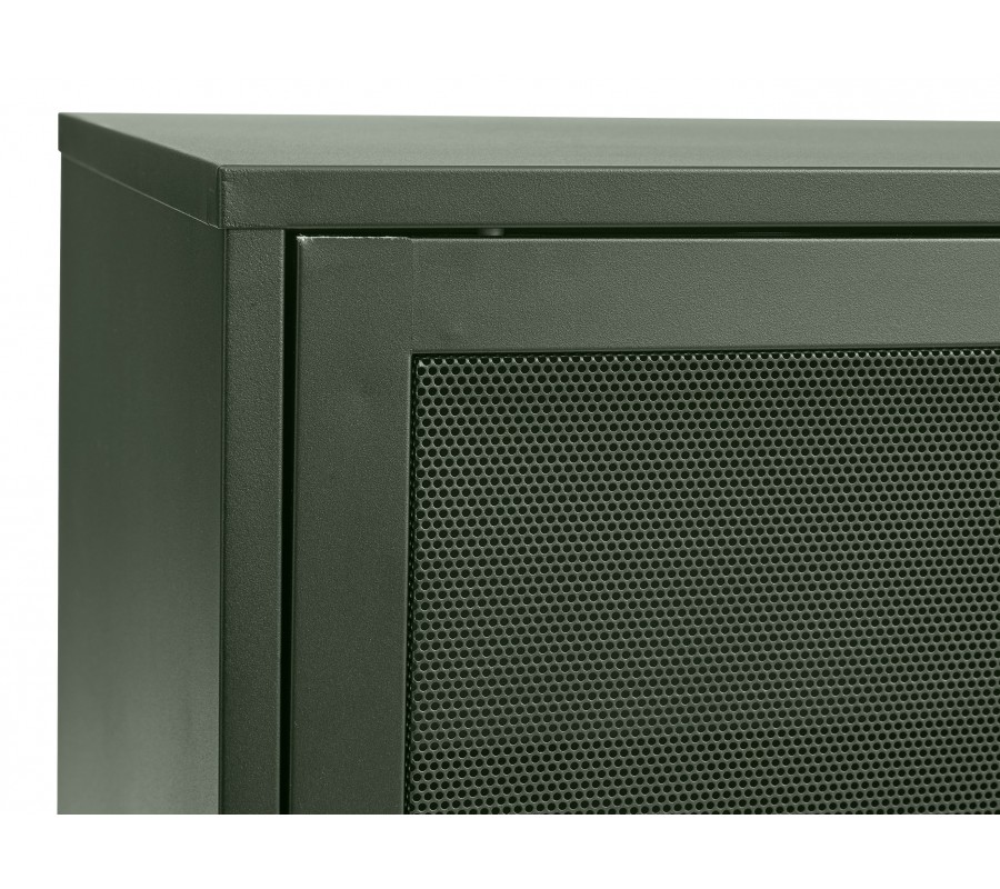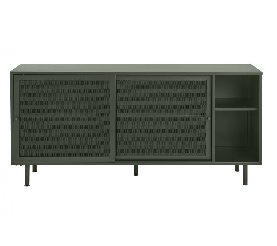 Moderní industriální příborník Vejle se dvěma perforovanými dvířky a policemi z kovu v olivové zelené barvě 160 cm