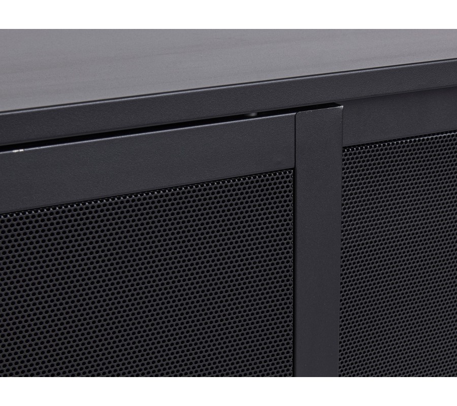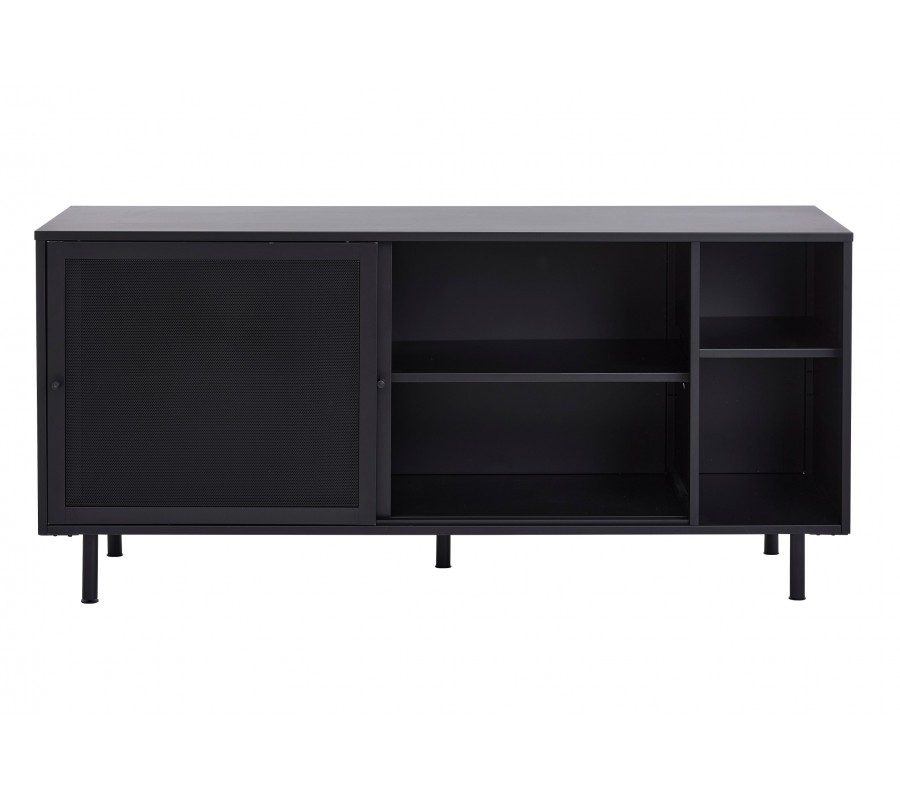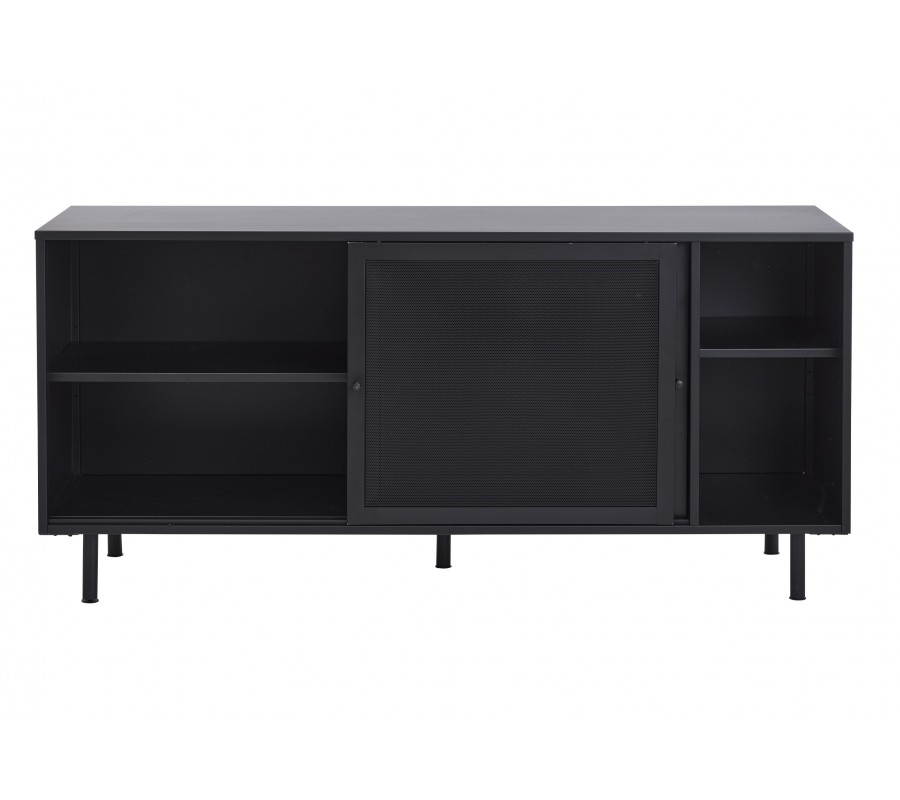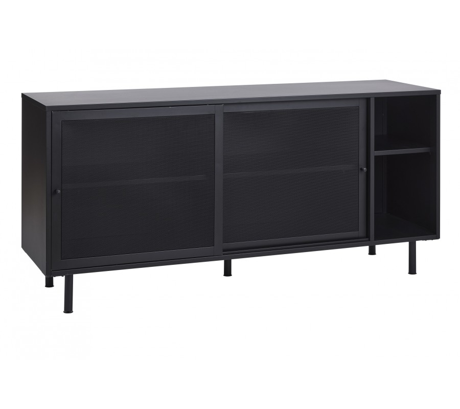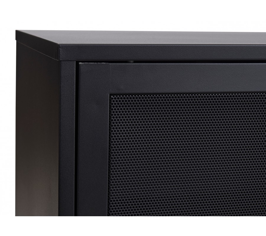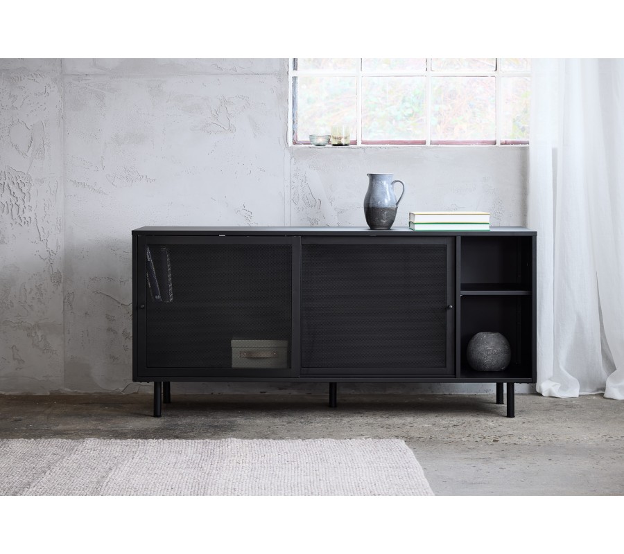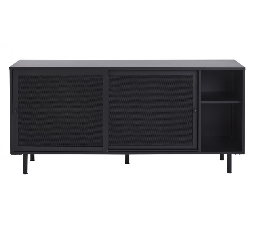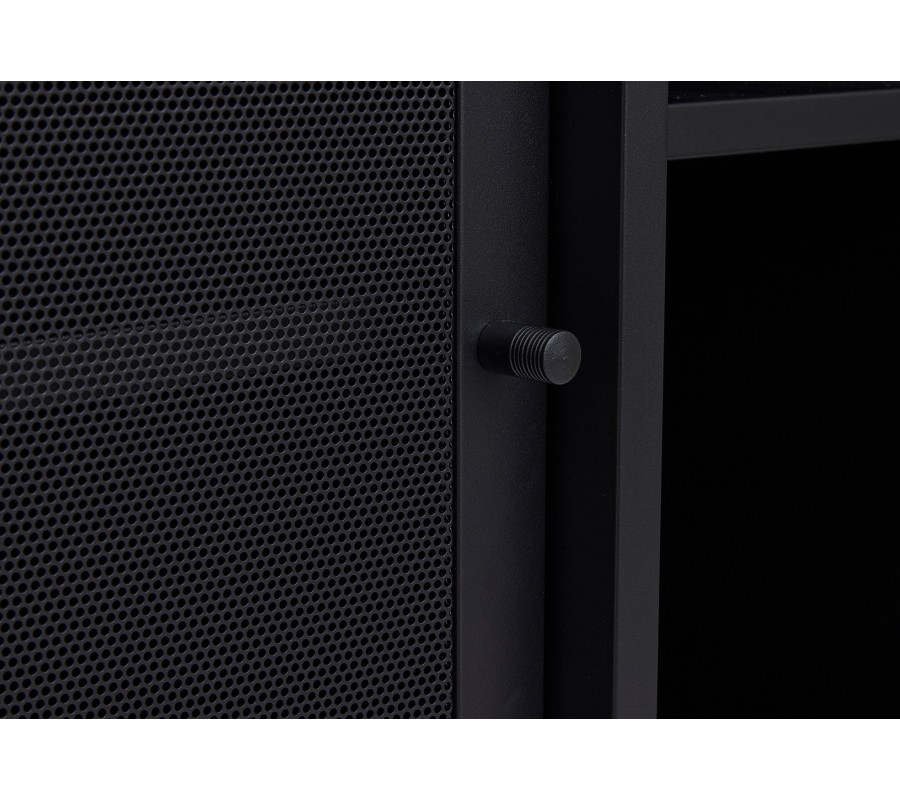 Industriální černý kovový příborník Vejle s policemi a dvěma posuvnými dvířky s perforovaným poloprůhledným vzorem 160 cm