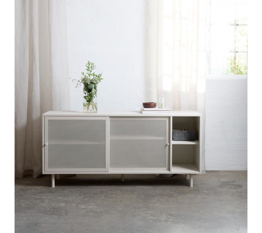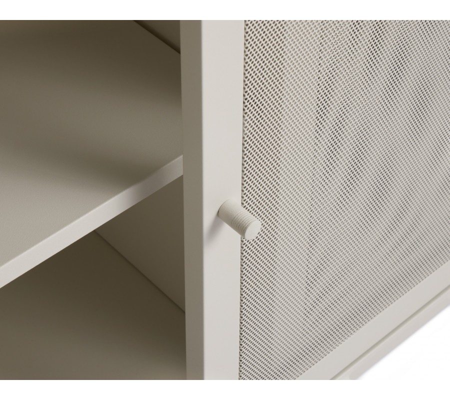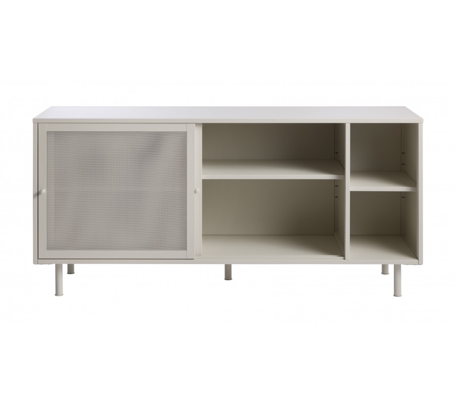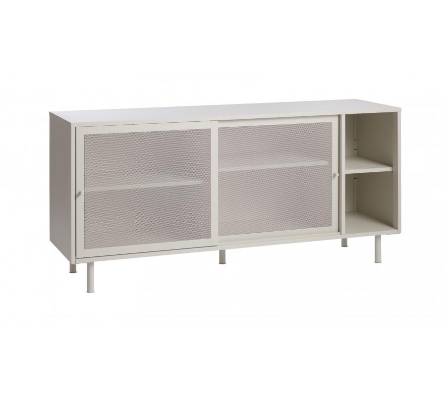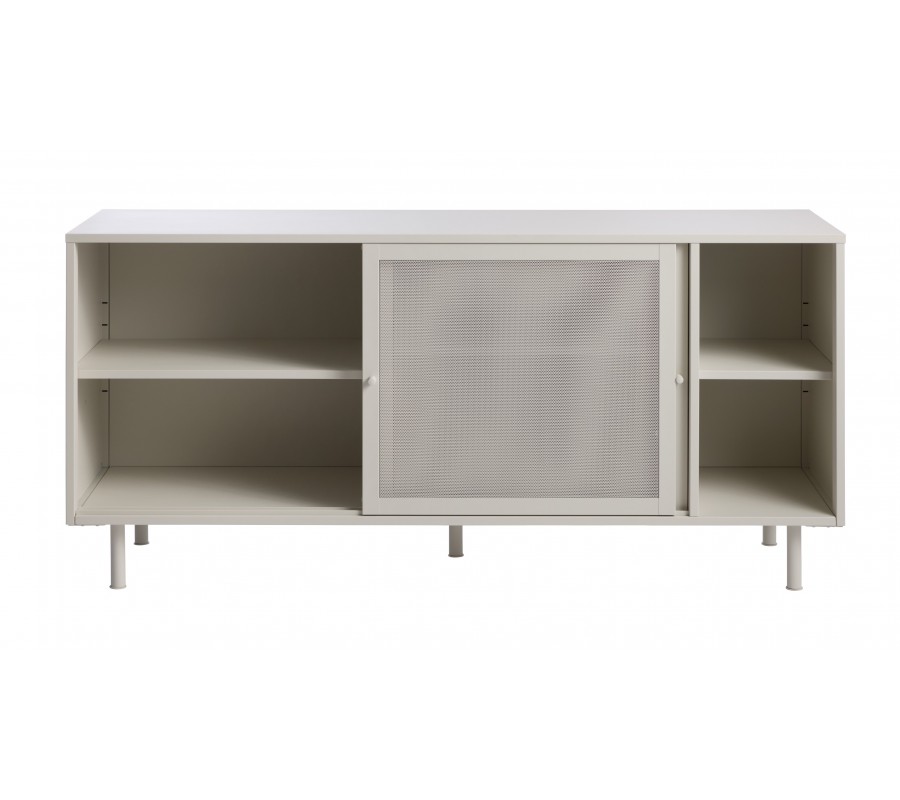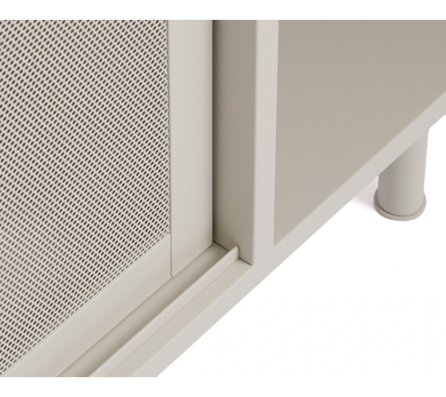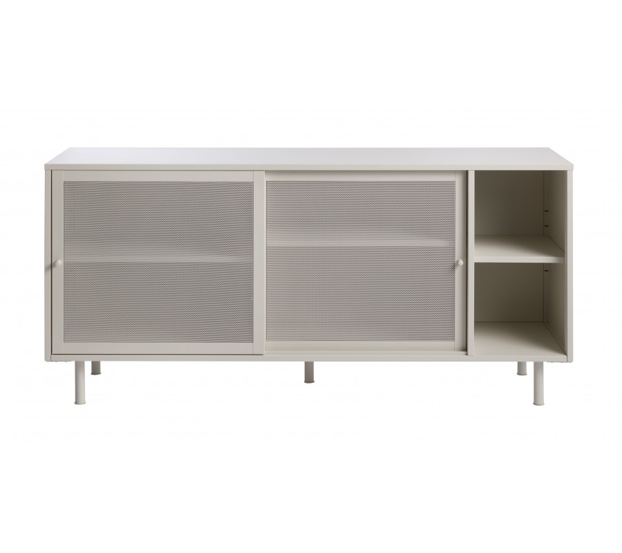 Moderní béžově šedý příborník Vejle v odstínu greige z kovu se dvěma posuvnými perforovanými dvířky a policemi 160 cm