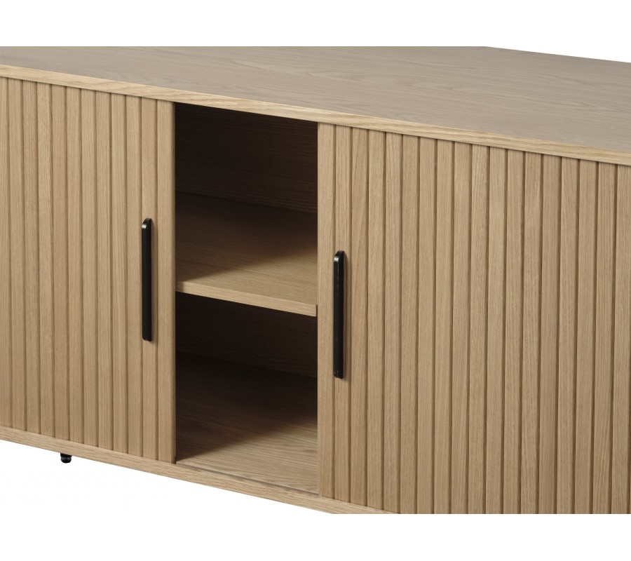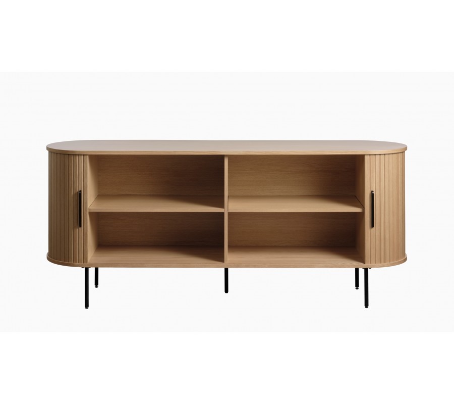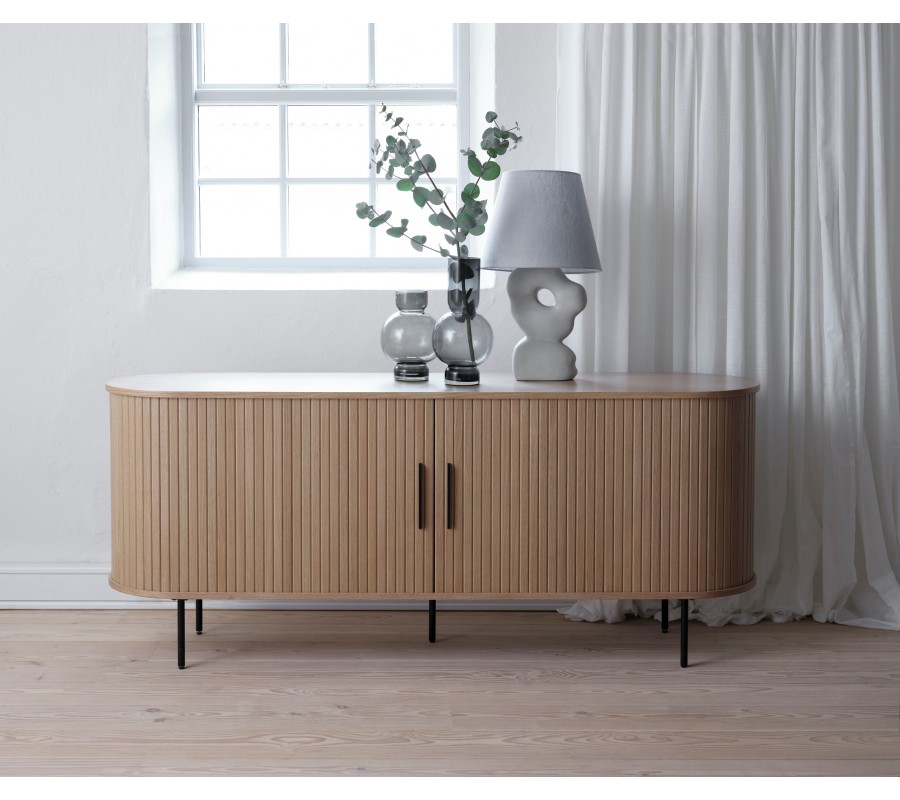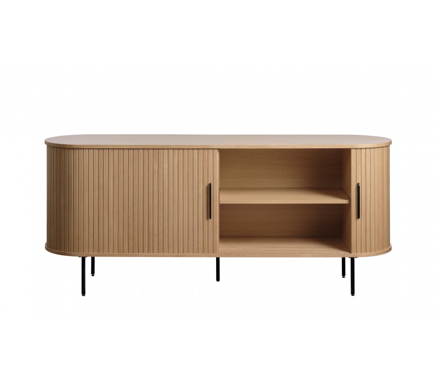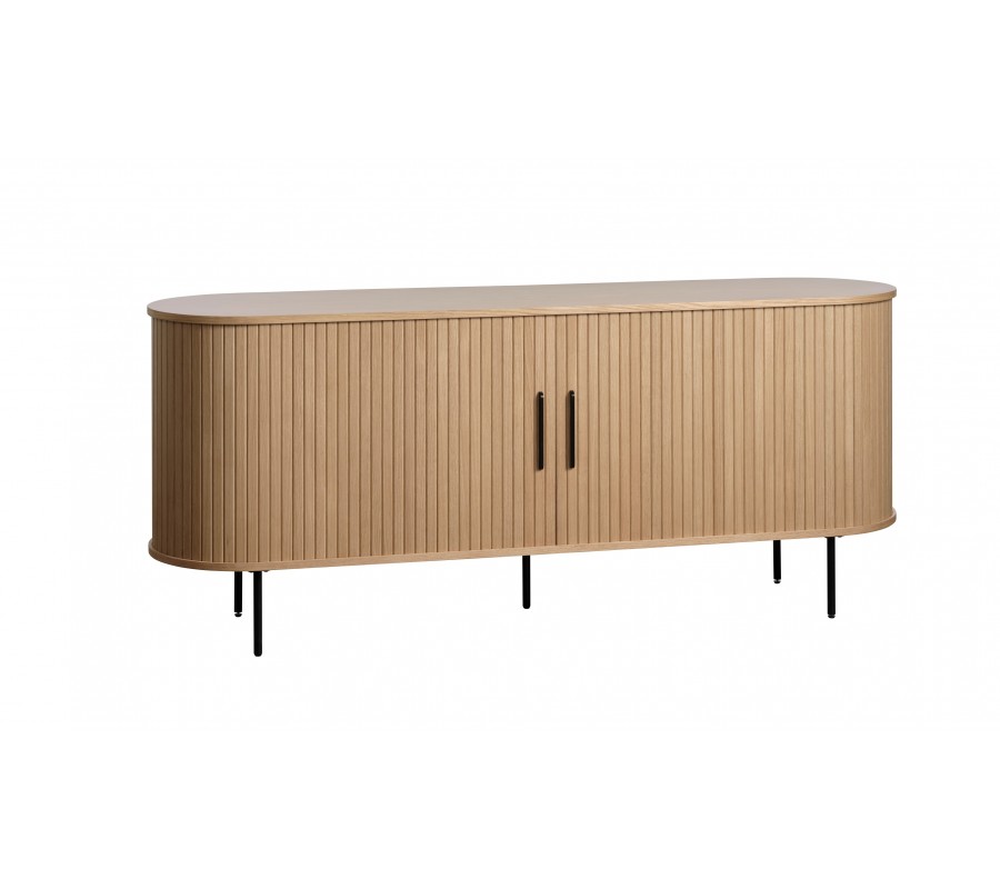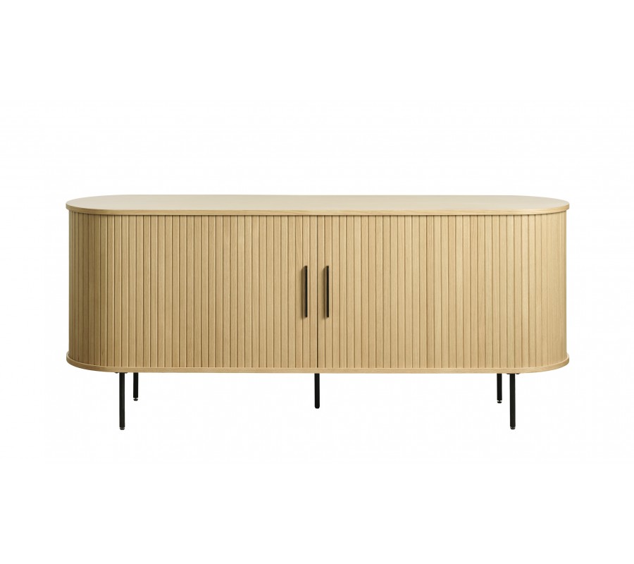 Oválný tvar definuje hladká vrchní deska o délce 180 cm, vhodná pro vystavení dekorací, rostlin nebo servírování. Designu dominuje vertikální lamelový dekor inspirovaný retro designem, do kterého jsou zasazena dvoje posuvná dvířka. Vnitřní prostor je rozdělen pomocí jedné svislé a jedné vodorovné příčky, čímž vznikají čtyři stejně velké úložné sekce.