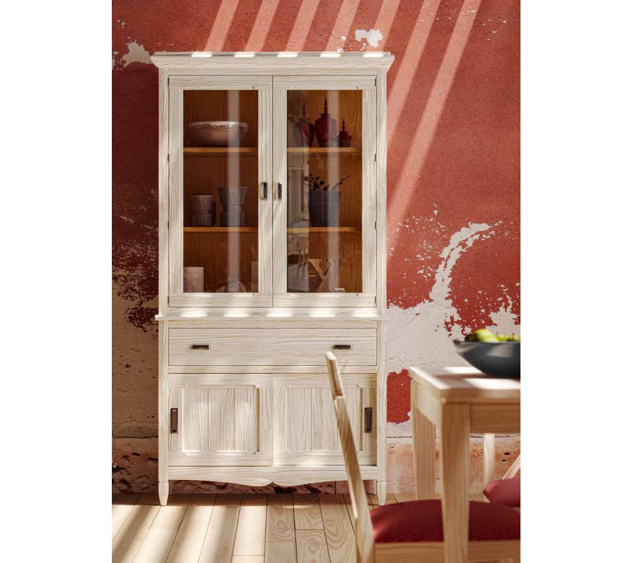 Elegantní masivní vitrína Amberes se skleněnými dvířky, šuplíky a posuvnými dvířky 210cm