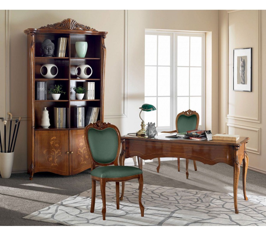 Celá sestava působí mimořádně honosně, přičemž zachovává praktičnost – psací stůl nabízí zásuvky s úložným prostorem a knihovna poskytuje dostatek místa pro knihy, dekorace či archivní materiály. Obě židle kombinují pohodlí s estetickým dojmem díky kvalitnímu čalounění a promyšleným ergonomickým proporcím.