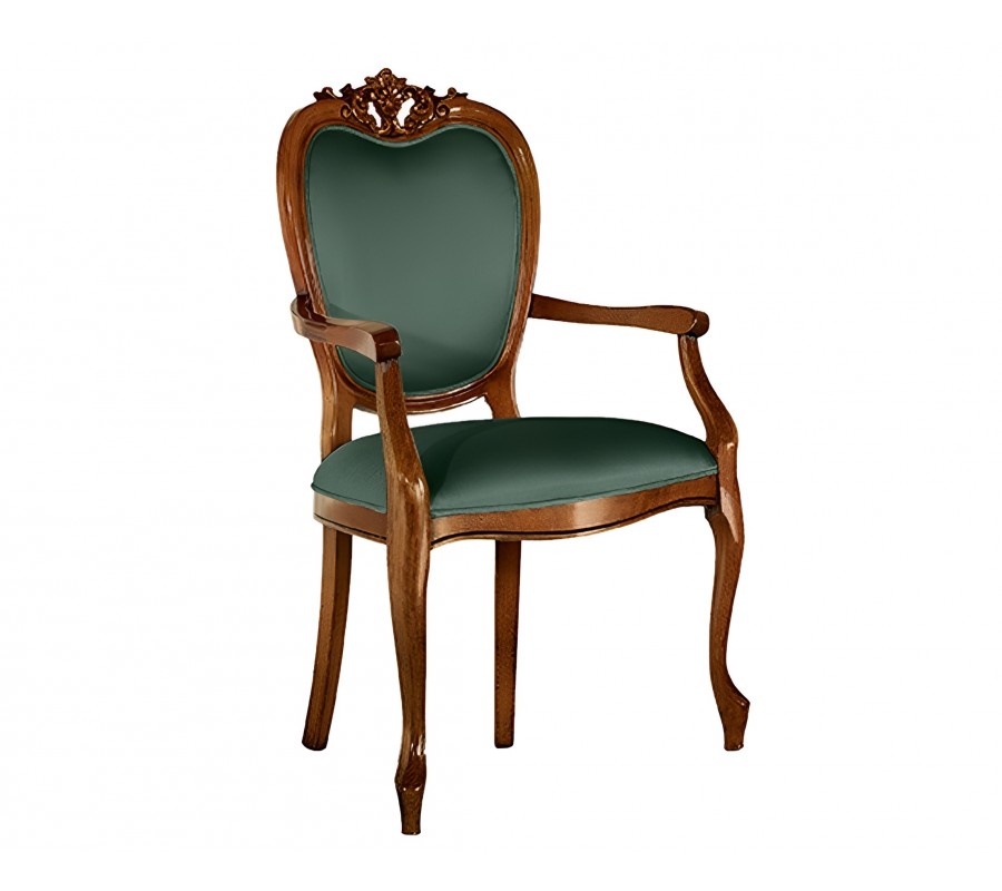 V sestavě naleznete čalouněné židle s opěrkami, židle bez opěrek, pracovní psací stůl a vysokou knihovnu – vše v harmonické kombinaci masivního dřeva s jemným dekorativním vyřezáváním. Teplý hnědý odstín dřeva doplňuje klasický charakter nábytku, který působí robustně, elegantně a zároveň reprezentativně.