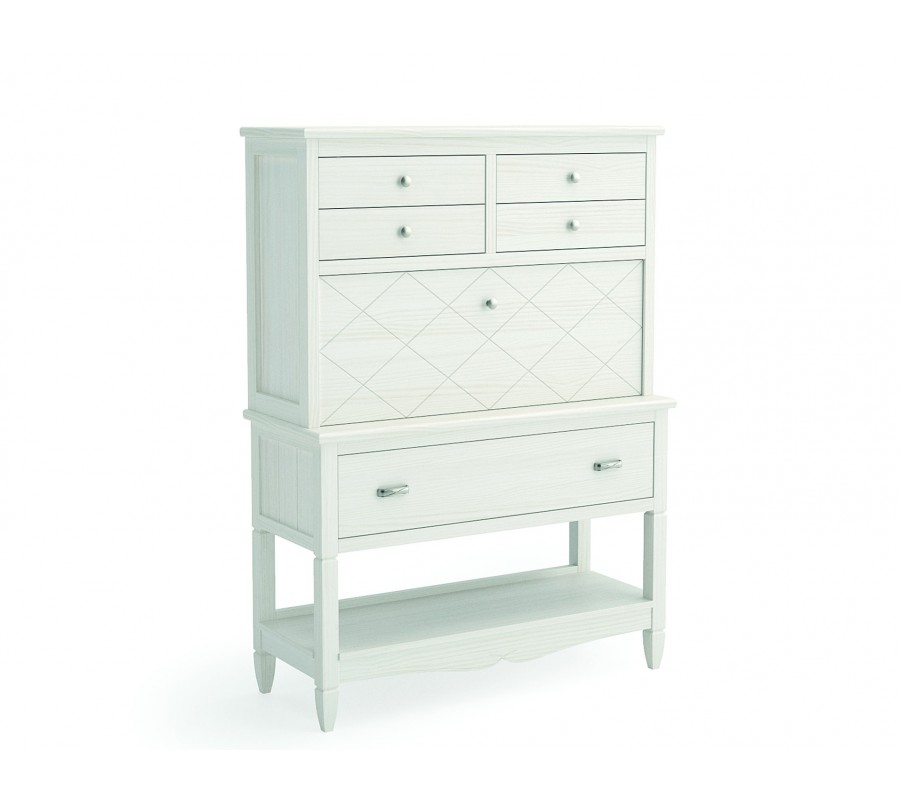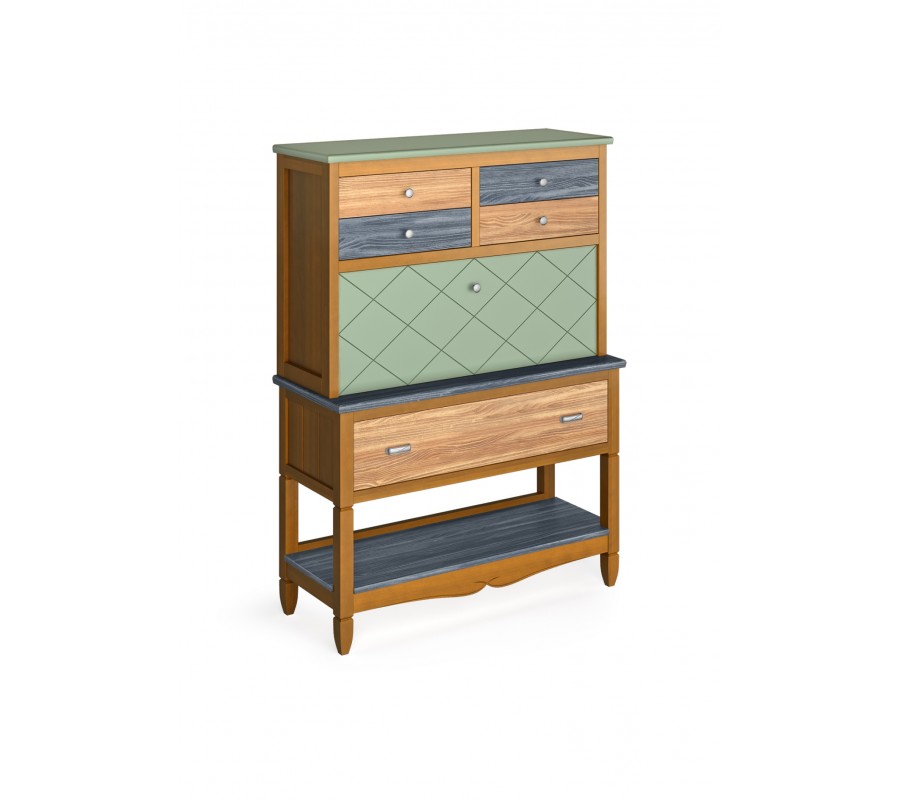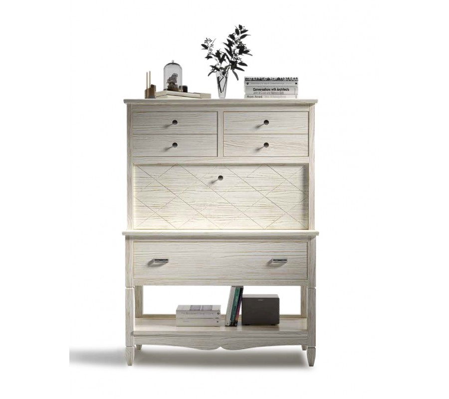 Ve vrchní části doplňují úložný prostor čtyři zásuvky umístěné ve dvou řadách s kulatými kovovými úchyty a lineární římsa nad nimi. Pod pracovní plochou se nachází široká zásuvka, která je hlubší než vrchní část a poskytuje tak výbornou oporu pro desku stolu. Doplňují ji dvě obdélníkové kovové úchytky. Dlouhé nohy mají hranatý profil a ve spodní části je mezi nimi umístěna velká otevřená police. Pod policí jsou jejich konce zeštíhleny. Tento detail, v kombinaci s vyřezávanou ozdobnou lištou se dvěma oblouky dodává nábytku venkovský výraz.