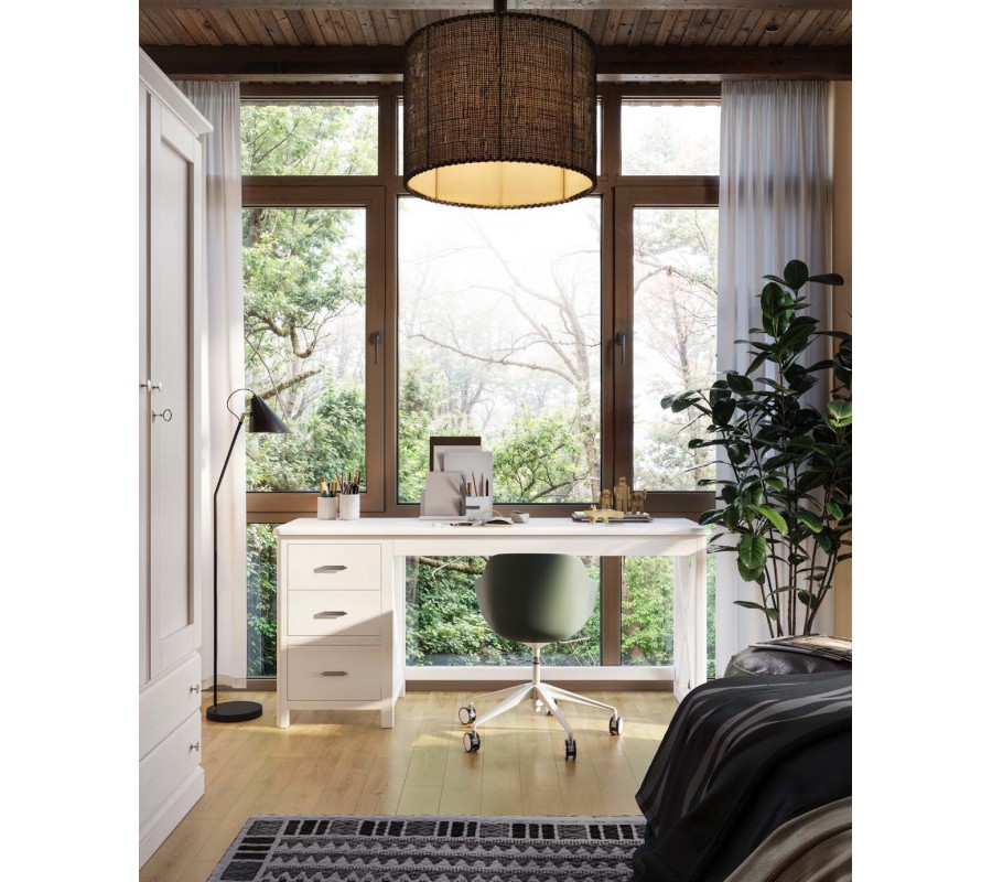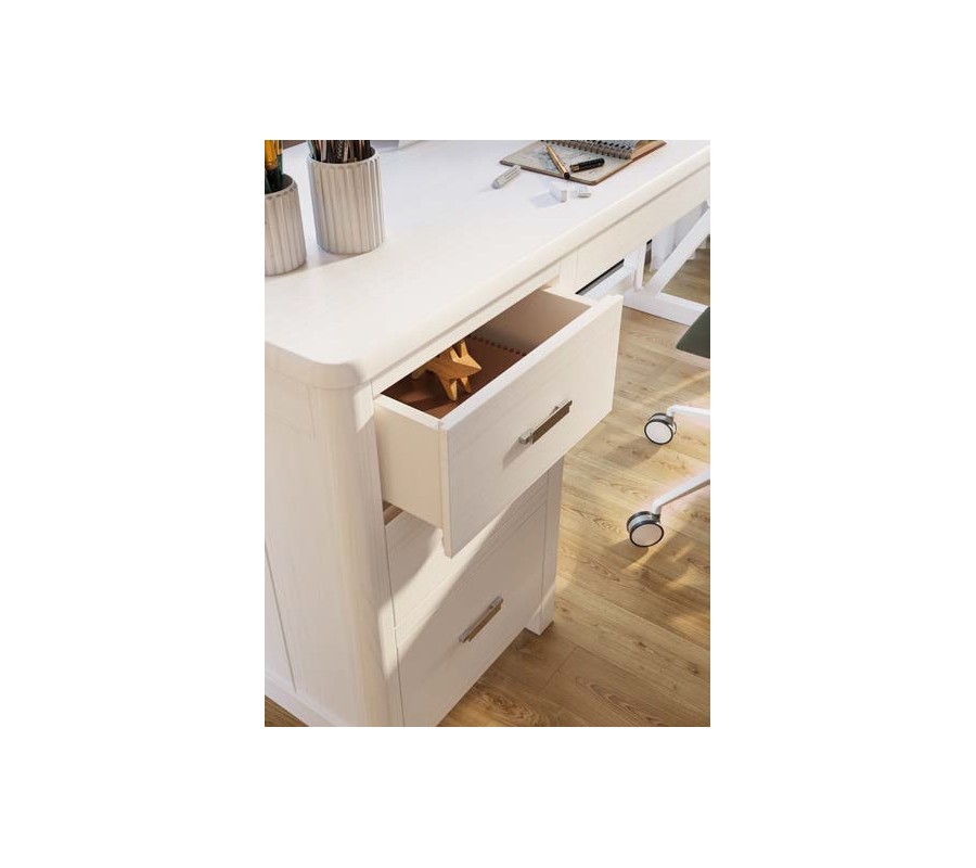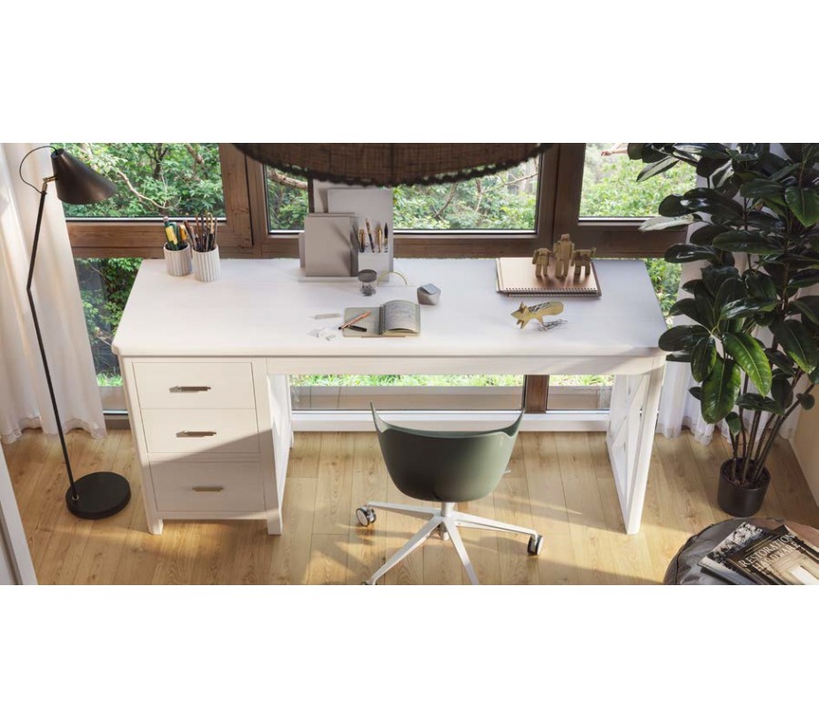 Moderní dřevěný psací stůl z kolekce Cerdena je inspirován romantickým italským ostrovem Sardinie. Přímé minimalistické linie spolu s oblými okraji táhnoucími se až po nožičky psacího stolu Cerdena mu dodávají minimalistický moderní nádech. Masivní psací stůl Cerdena, inspirovaný moderními trendy, disponuje mohutným provedením ruční výroby. Dřevěná vrchní deska psacího stolu Cerdena je zdobená jemným, vyřezávaným zdobením se zaoblenými rohy. Dominantou masivního psacího stolu Cerdena je jeho mohutný dřevěný rám, který je kontrastně doplněn jemnou povrchovou úpravou a rukojeťmi ve vintage stylu ve dvou barevných provedeních - starozlaté a stříbrné barvy. Praktická skříňka se třemi zásuvkami a dostatkem úložného prostoru ve spojení s moderním provedením vytváří nadčasový kousek vhodný do moderních pracoven či dětských pokojů. Barevné provedení psacího stolu Cerdena lze vybrat dle vzorníku dřeva, který naleznete iv našem showroomu na Zámecké ulici 24.