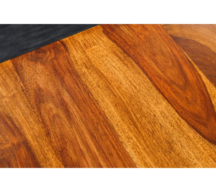 Vrchní deska je vyrobena z masivního akáciového dřeva v hnědé barvě s lakovaným povrchem, který chrání povrch při každodenním používání a zároveň zvýrazňuje výraznou kresbu letokruhů a přirozenou strukturu dřeva. Deska má obdélníkový tvar s nepravidelnými hranami ve stylu live edge, díky čemuž působí autenticky a každý kus má jedinečný vzhled.