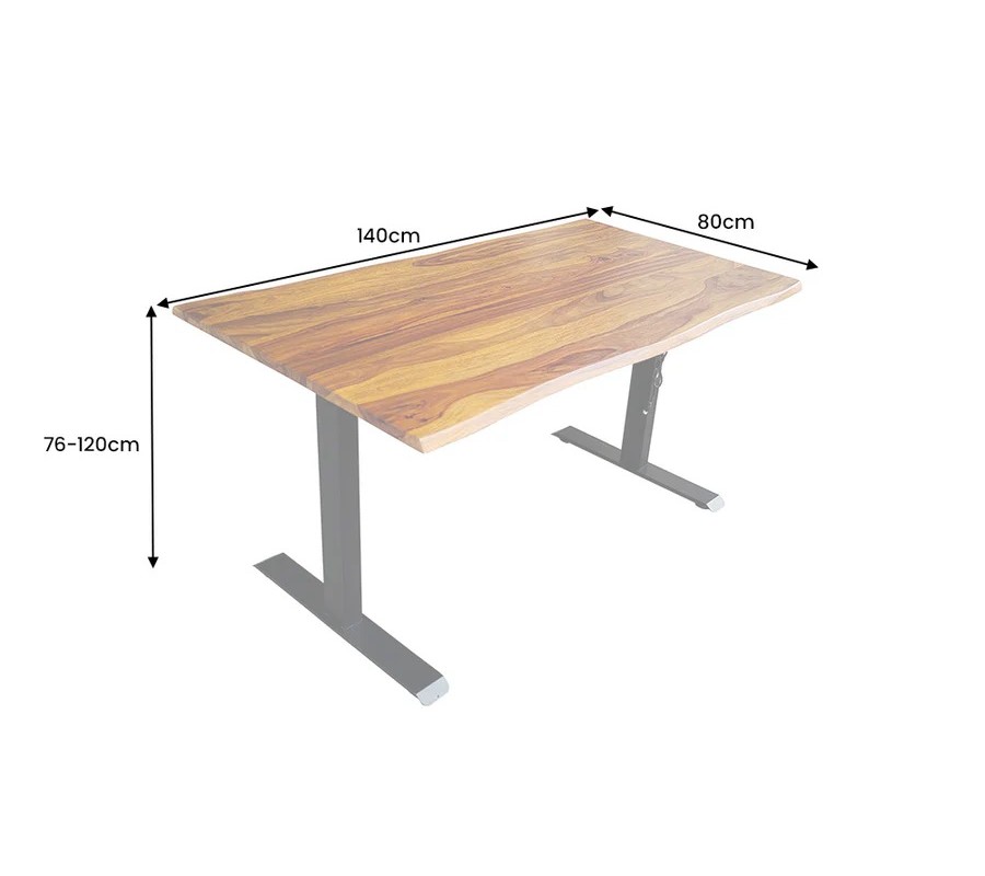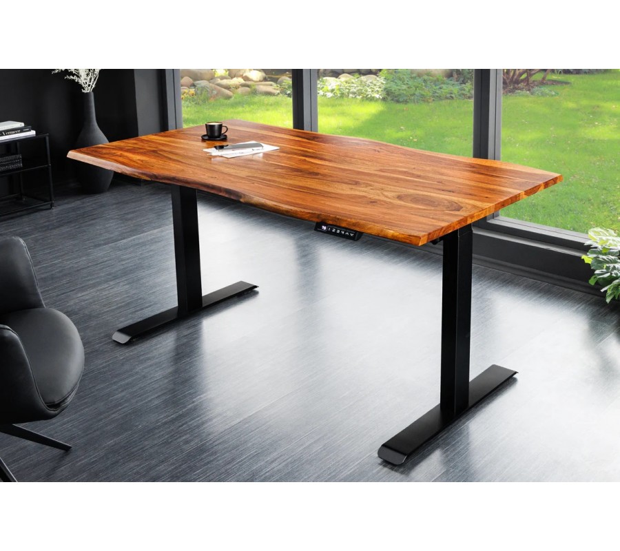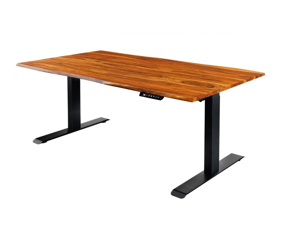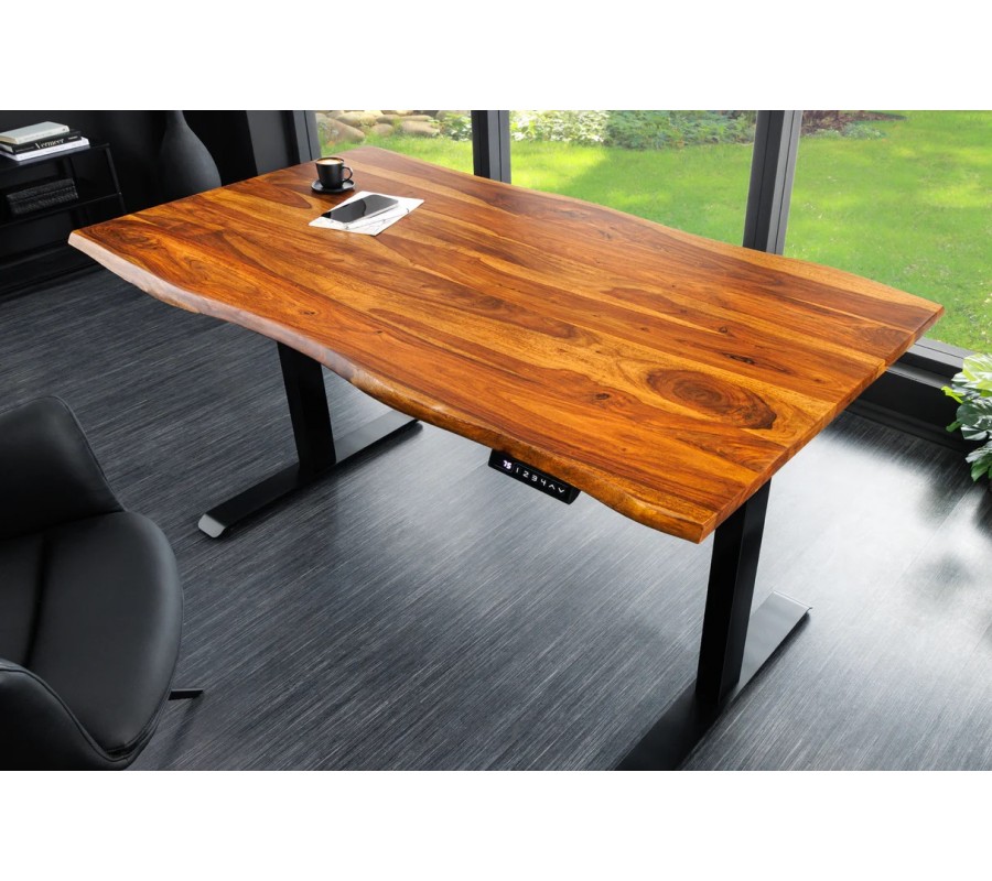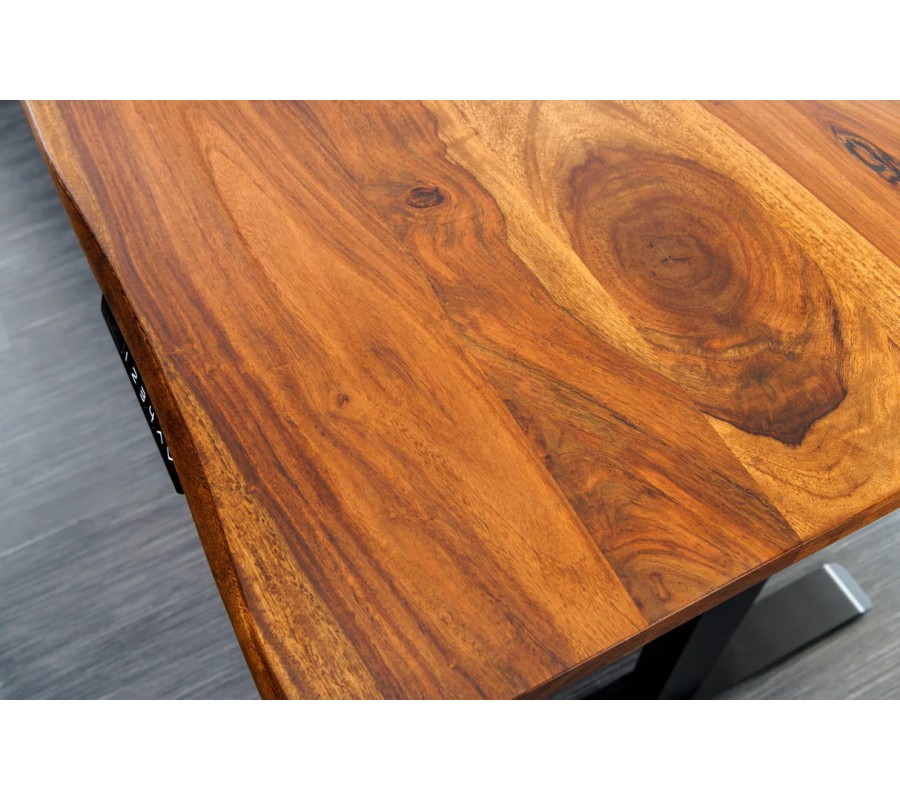 Industriální masivní obdélníkový psací stůl Mammut s elektrickým výškovým nastavením je výrazným a funkčním kusem nábytku, který spojuje přírodní sílu masivního dřeva s moderní technologií. Je ideální volbou pro ty, kteří hledají ergonomické pracovní řešení s autentickým industriálním charakterem.
