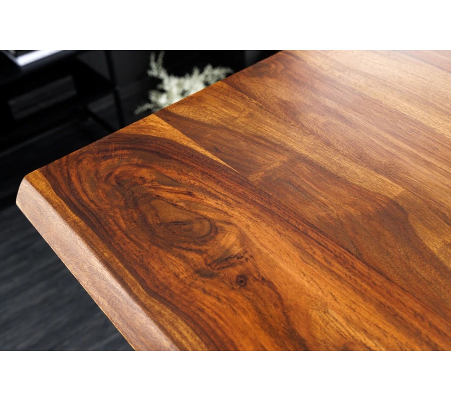 Vrchní deska je vyrobena z masivního akáciového dřeva v hnědé barvě s lakovaným povrchem, který chrání povrch při každodenním používání a zároveň zvýrazňuje výraznou kresbu letokruhů a přirozenou strukturu dřeva. Deska má obdélníkový tvar s nepravidelnými hranami ve stylu live edge, díky čemuž působí autenticky a každý kus má jedinečný vzhled.