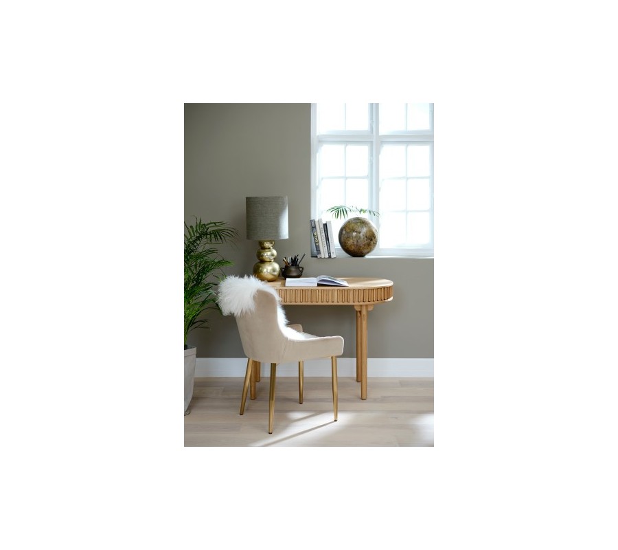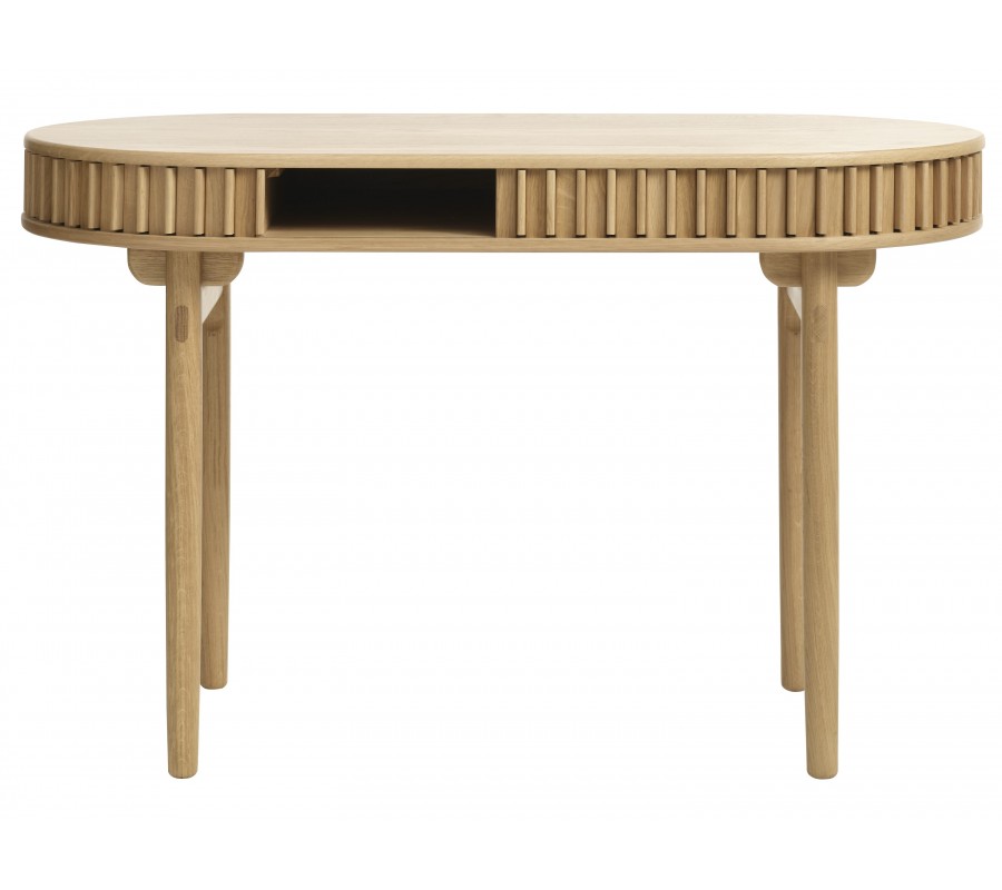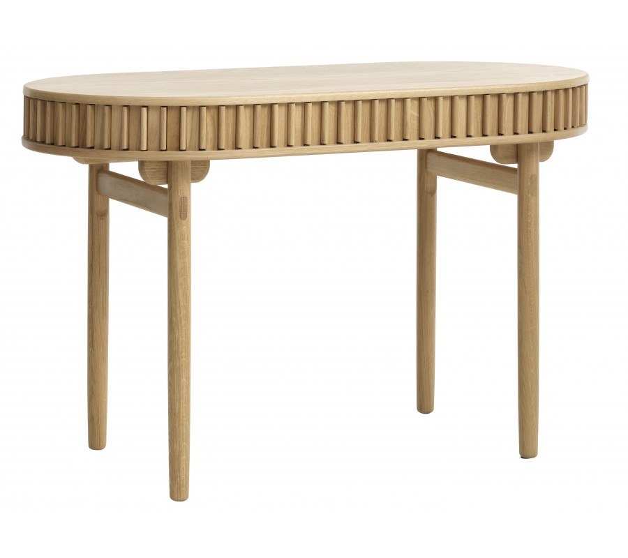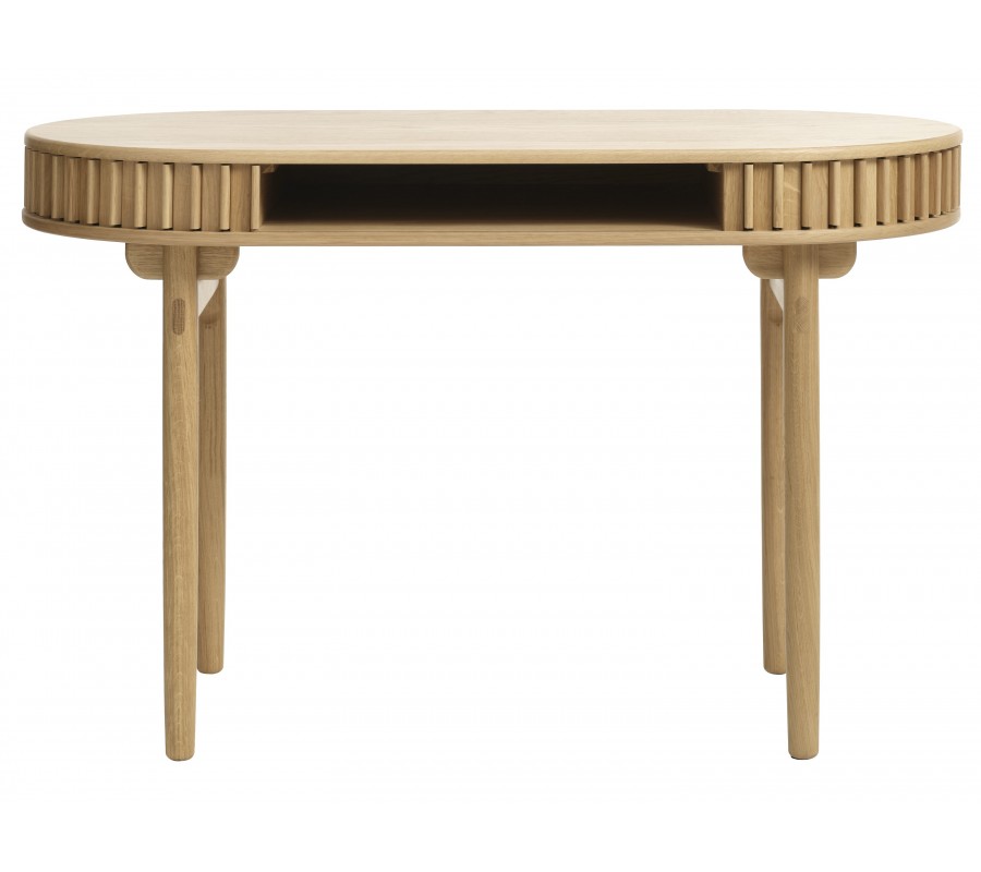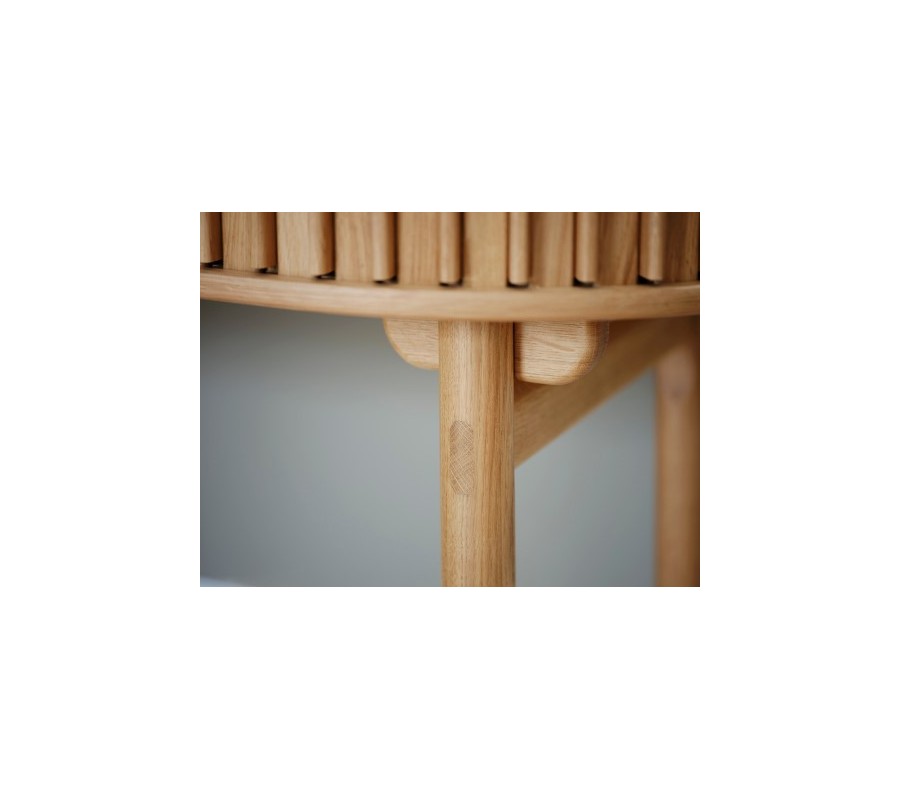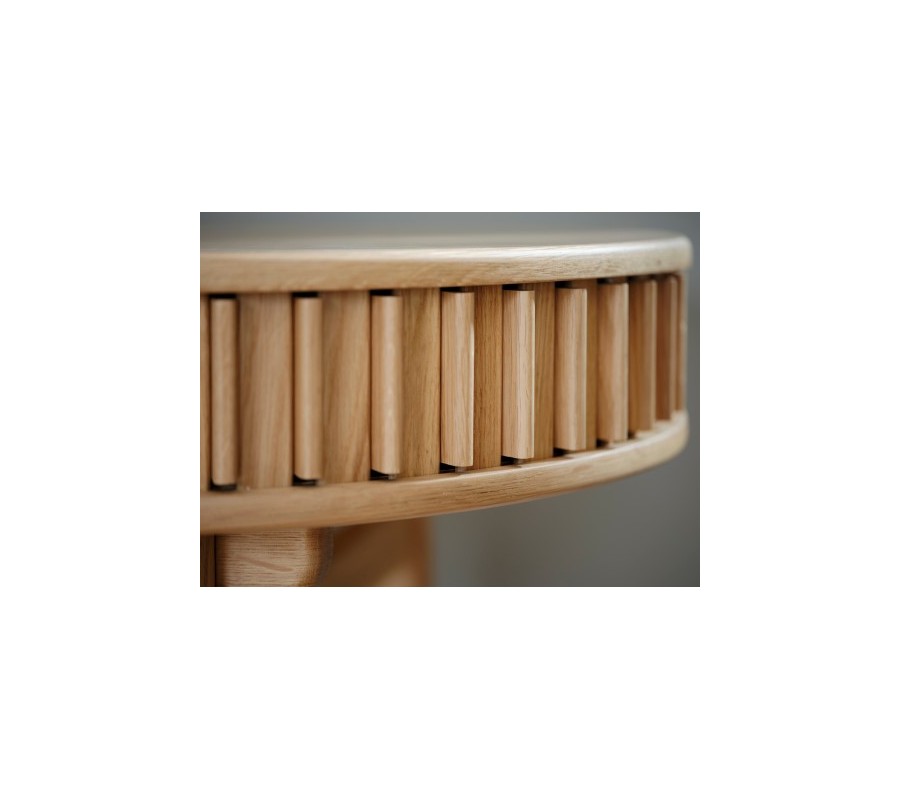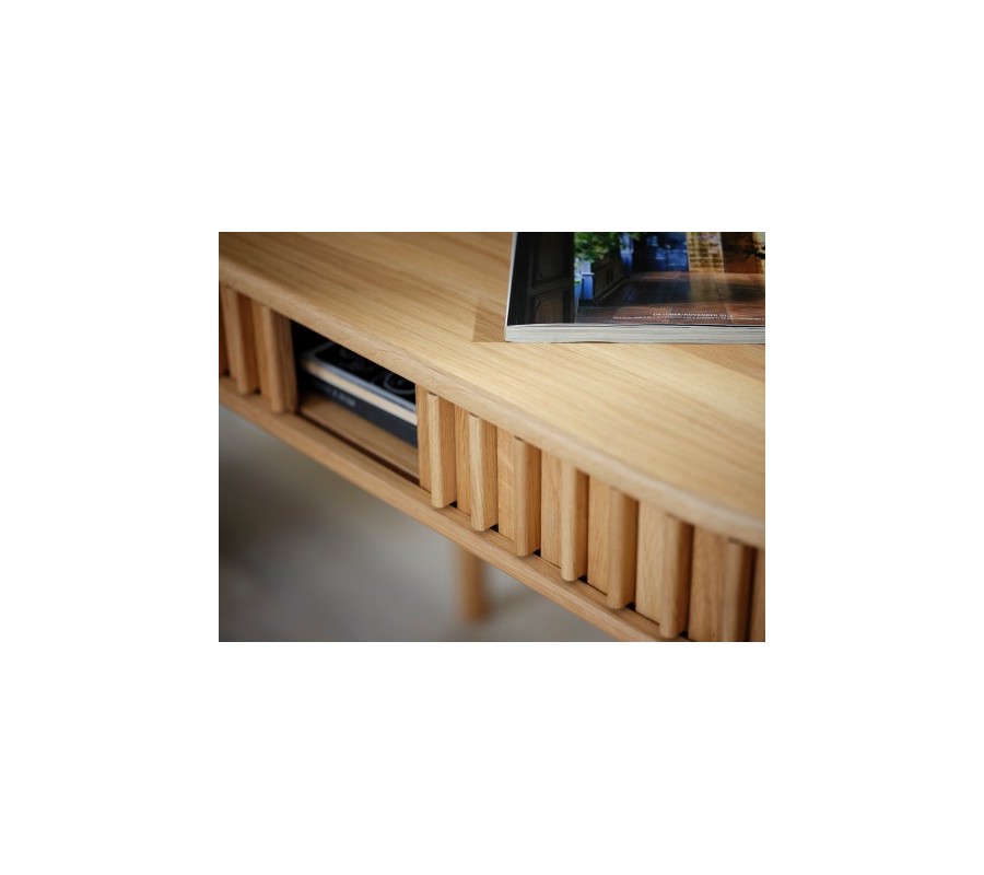 Stůl má ovální desku s hladkým povrchem o rozměru 120x60 cm, jejíž tvar kopíruje spodní část úložného prostoru. Mezi nimi je obvod stolku vyplněn hladkým pláštěm s pravidelně rozmístěnými vertikálními lamelami. Je pohyblivý a při jeho posouvání se otevře praktická nízká police, ideální pro psací potřeby či dokumenty. Drážkovaný design a zaoblené tvary dodávají nábytku výrazný retro nádech, zatímco samotný úložný prostor je při uzavření nenápadný a harmonicky integrován do designu.