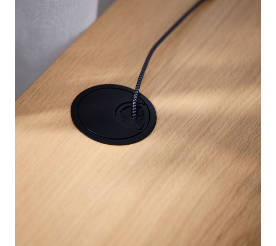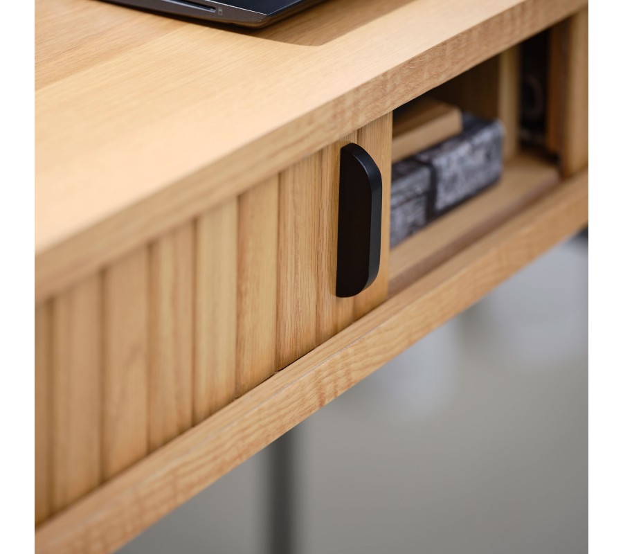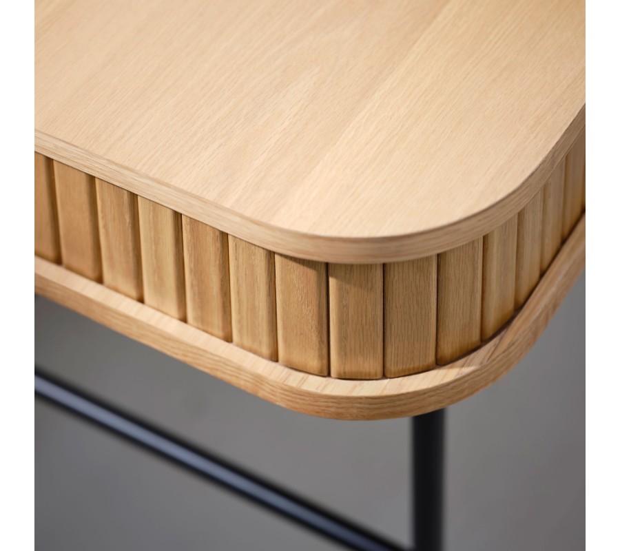 Stůl má obdélníkovou vrchní desku se zaoblenými rohy a hladkým povrchem, na kterém vyniká struktura dřeva. V levém rohu ji doplňuje praktický otvor pro vedení kabelů. Pod deskou se nachází uzavíratelný úložný prostor se dvěma posuvnými dvířky, které v kombinaci s vertikálním lamelovým dekorem odkazují na inspiraci re.