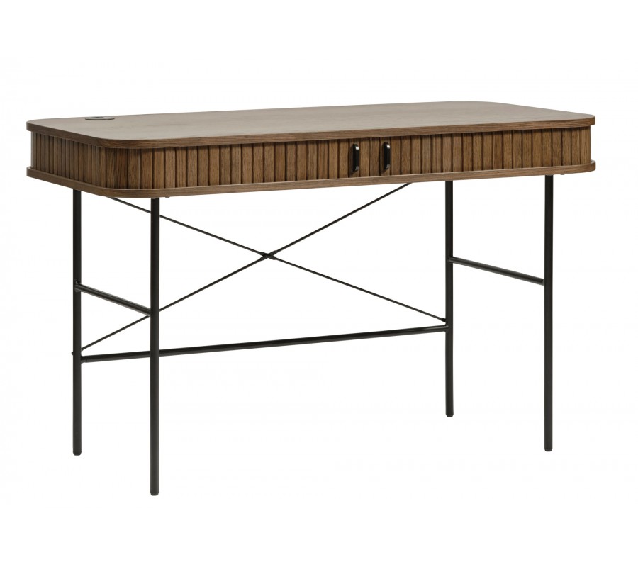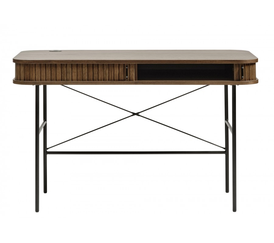 Industriální psací stůl Bornholm s lamelovými posuvnými dvířky a černýma nohama v tmavém hnědém dubovém provedení 120 cm