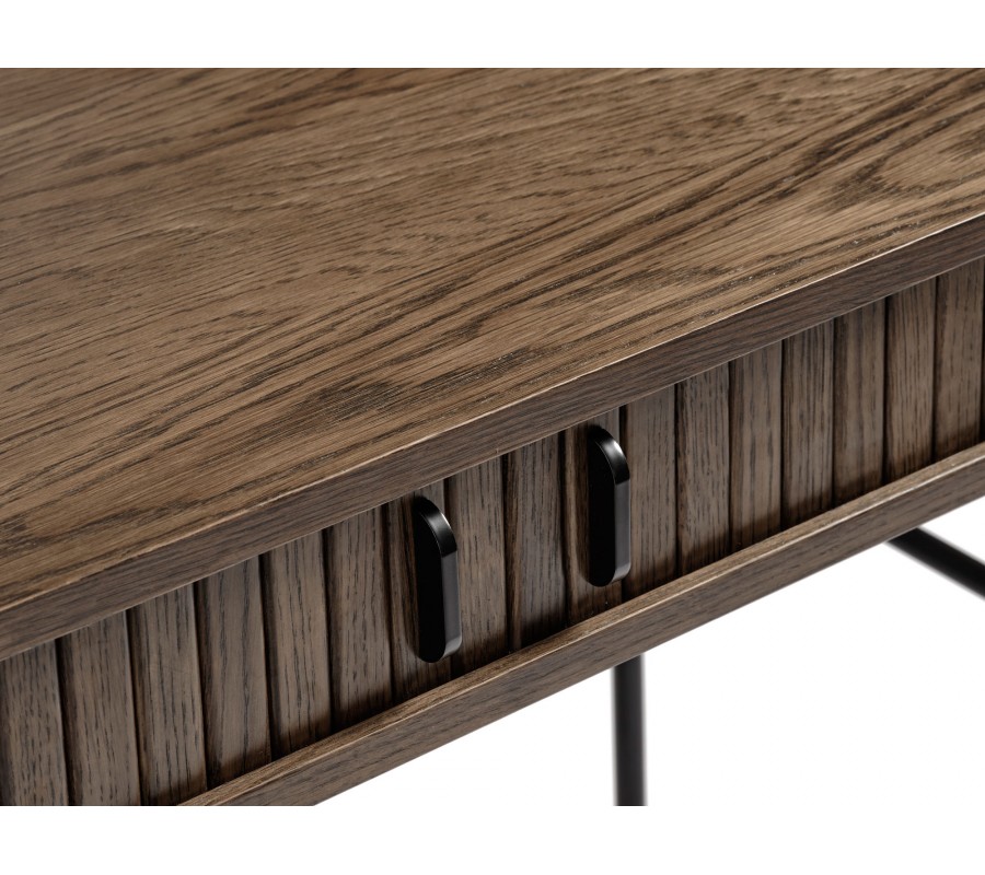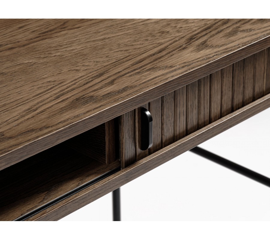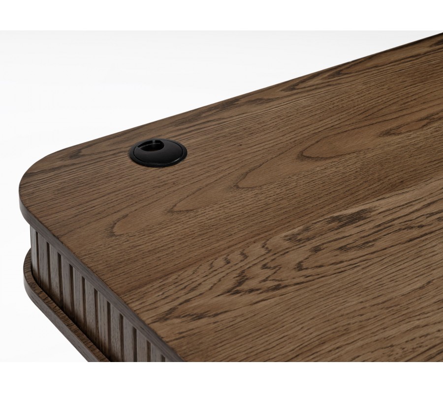 Stůl disponuje obdélníkovou deskou se zaoblenými rohy a hladkým povrchem, na kterém vyniká struktura dřeva. V levé části se nachází praktický otvor pro vedení kabelů. Pod pracovní plochou je umístěn uzavíratelný úložný prostor s dvojicí posuvných dvířek, jejichž vertikální lamelové zdobení odkazuje na retro design.