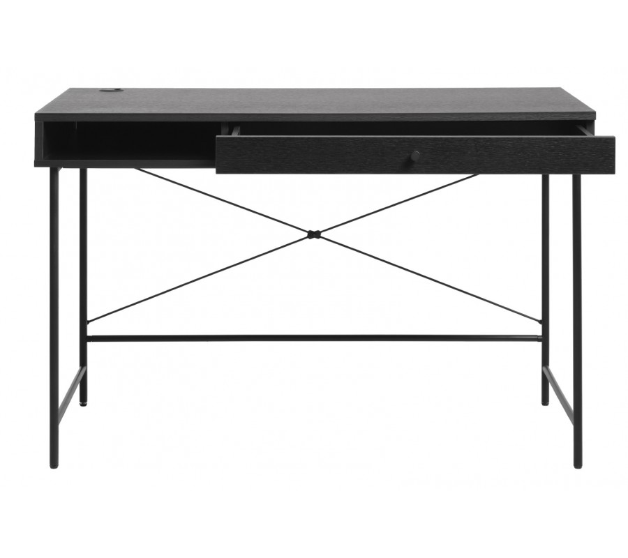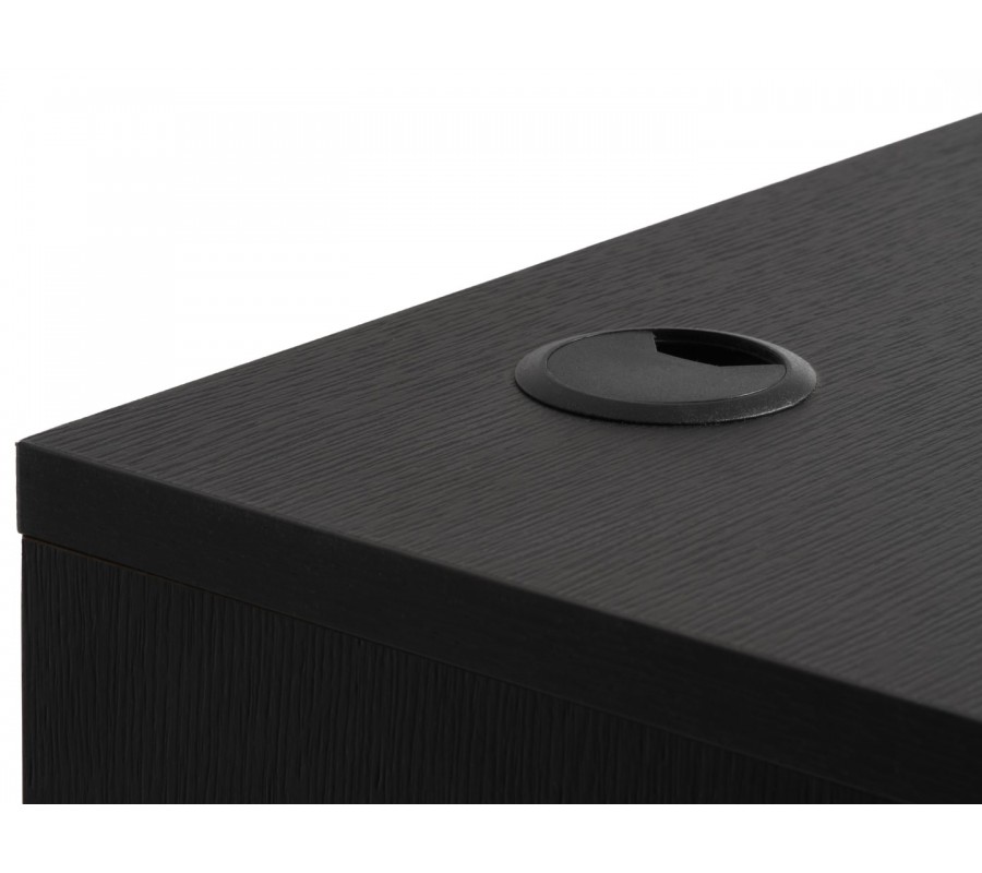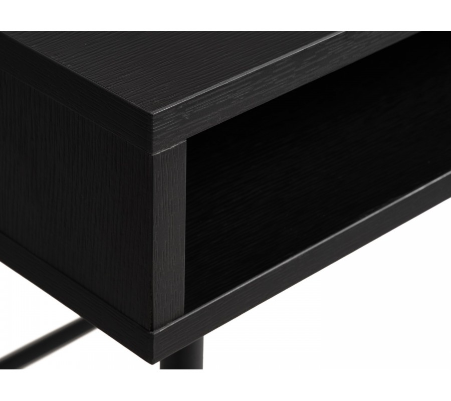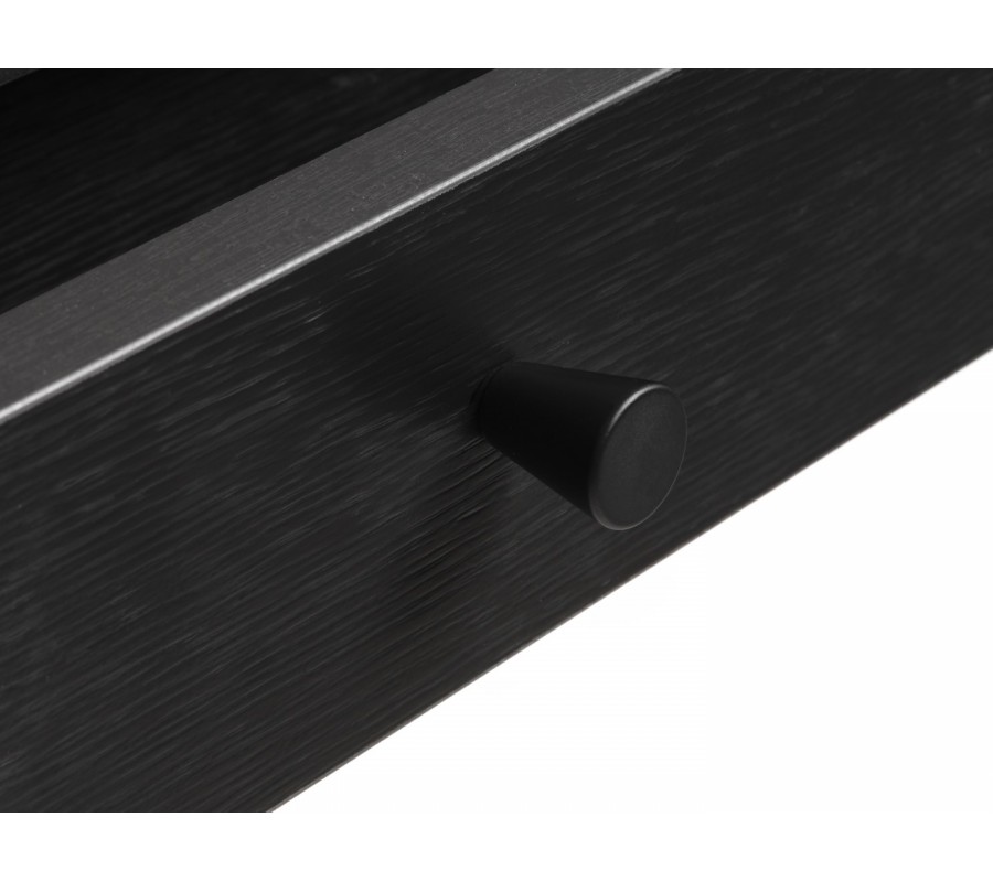 Vrchní část stolu je vyrobena z kvalitní MDF dýhy s melaminovou povrchovou úpravou, zaručující vysokou odolnost vůči vlivům každodenního používání. Černé lakování doplňuje jemná struktura dřeva, která vytváří přírodní akcent. Obdélníková vrchní deska je hladká a pod ní se nachází úložný prostor, rozdělený na jednu polici a jednu zásuvku s kulatým úchytem. Nechybí ani praktický otvor pro vedení kabelů.