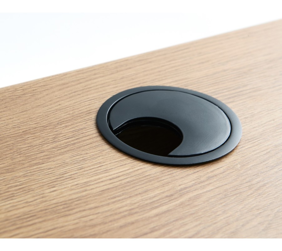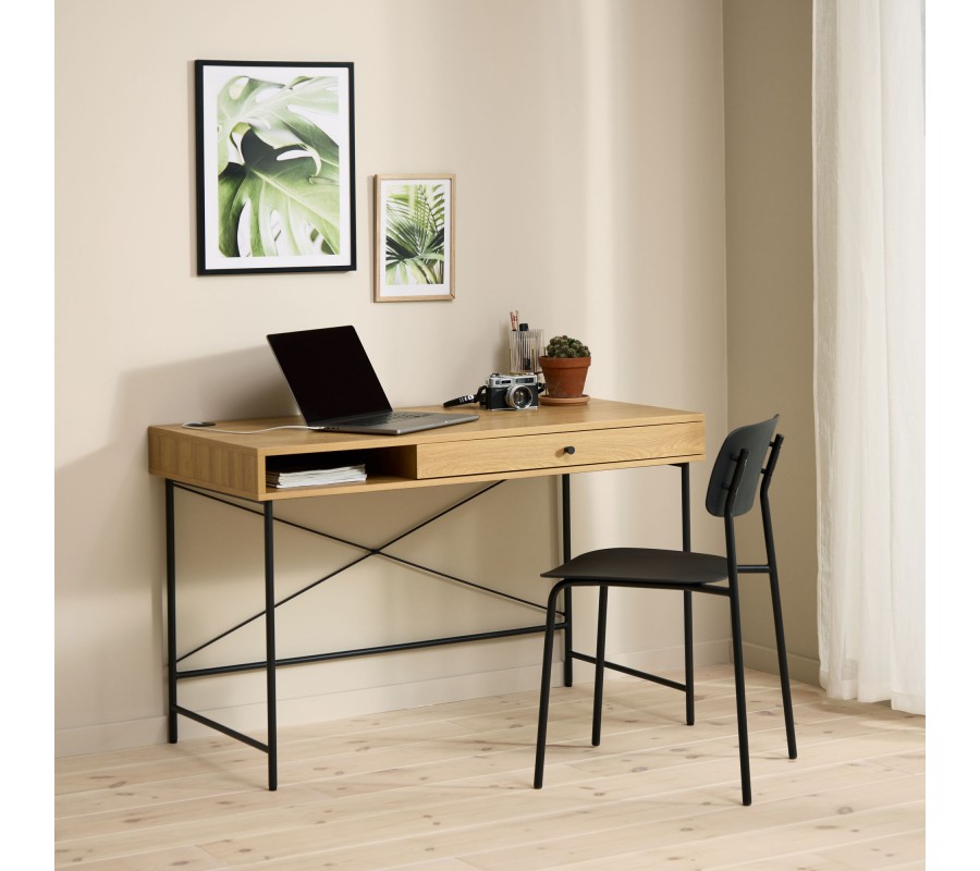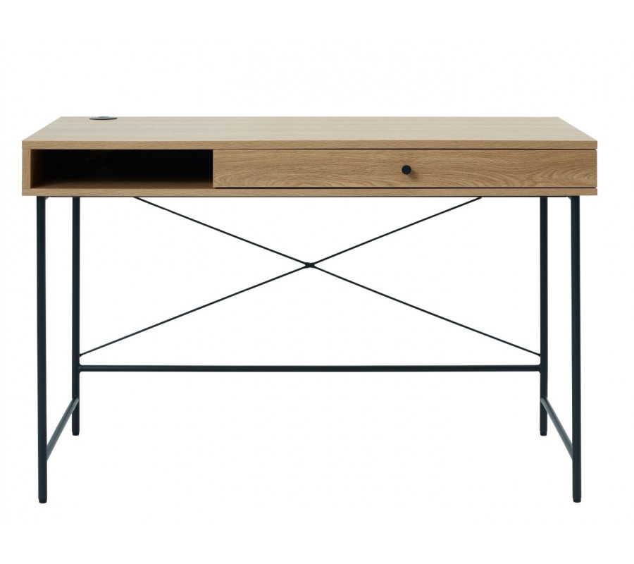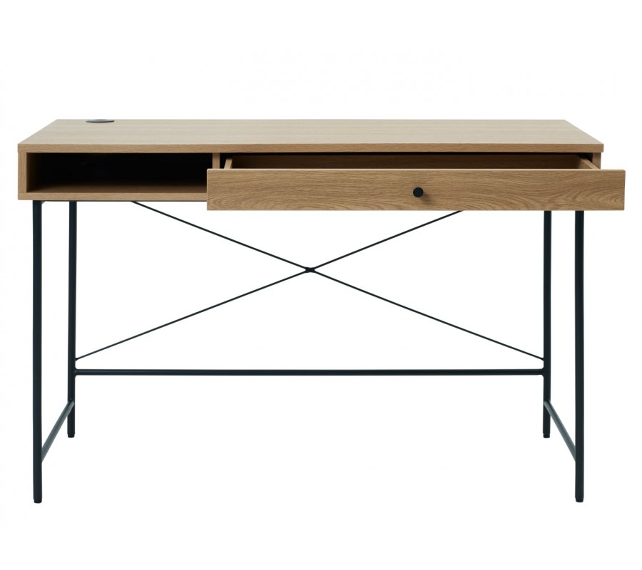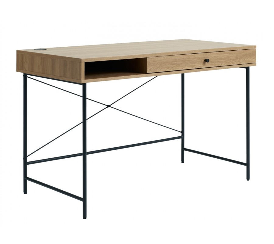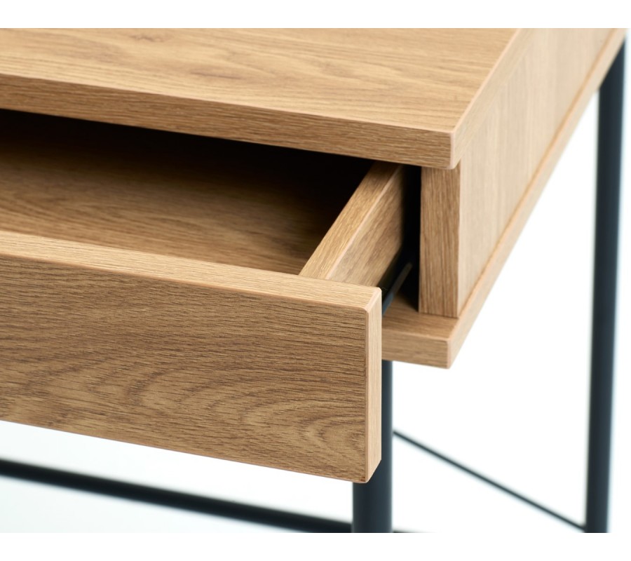 Horní část je vyhotovena z kvalitní MDF dýhy s melaminovou úpravou, která zvyšuje její odolnost vůči běžnému opotřebení. Povrch ve světlém hnědém dubovém dekoru působí přirozeně a vnáší do prostoru příjemný, teplý akcent, typický pro skandinávský styl. Pod obdélníkovou pracovní plochou se nacházíúložný prostor rozdělený na polici a zásuvku s kulatým kovovým úchytem, umístěnými vedle sebe. Nechybí ani praktický otvor pro vedení kabelů.
