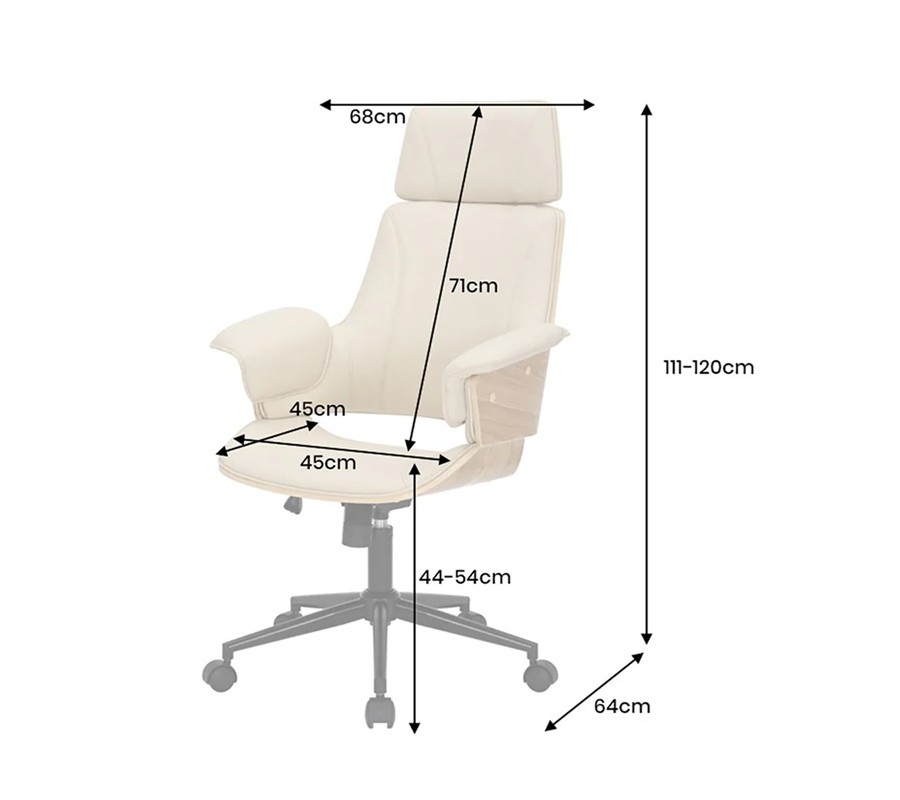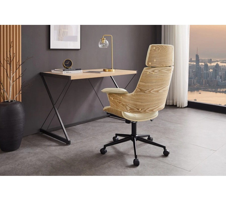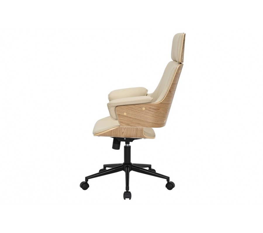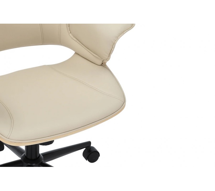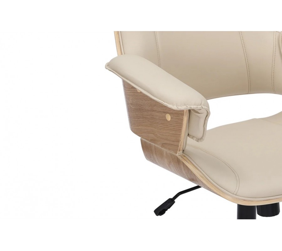 Kancelářka židle má originální design sedáku a opěrky, kde se na vnitřní straně nachází pěnová výplň a potah z ekokůže a na vnější straně pevný rám zdy. Světlý krémově béžový odstín potahu krásně koresponduje s naturální světle hnědou barvou dřeva s výraznou kresbou letokruhů. Ekokůže je hladká, příjemná na dotek a zároveň nenáročná na údržbu.