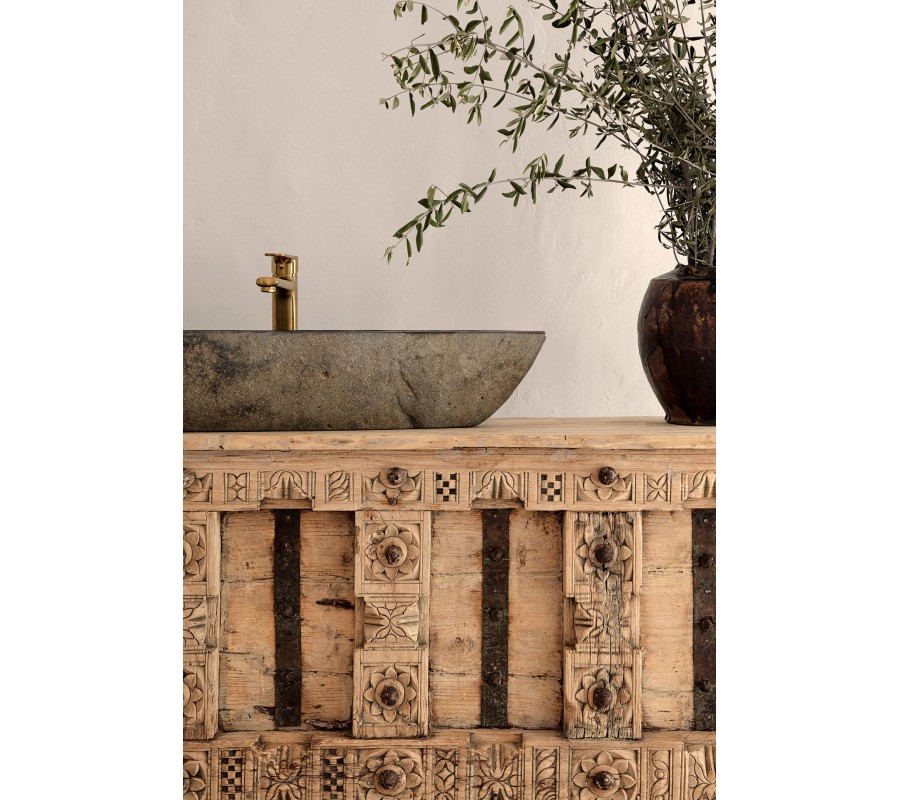 Umyvadlo Liesy je moderním prvkem pro interiéry, které preferují surový design a autentické materiály. Vyrobeno z masivního přírodního kamene v jemně šedé barvě, uchovává si přirozenou strukturu s jemně nerovným povrchem, čímž připomíná skutečný kus přírody přenesený do vaší koupelny.
