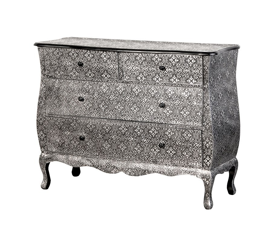 Nepřehlédnutelná vzorovaná reliéfní komoda stříbrné barvy v nezaměnitelném vintage stylu je vhodná k jednobarevným stěnám z důvodu jejího vzorovaného tepaného povrchu. Pokud se rozhodnete pro výběr nábytku GLORIA jistě zaujmete pozornost každého návštěvníka vašeho domova.