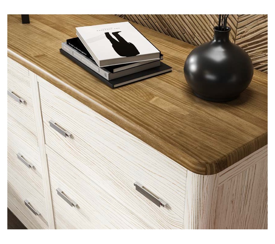 Vrchní deska má široký obdélníkový tvar a poskytuje dostatek místa na svítidla, knihy, dekorace či úložné koše a krabičky. Mírně přečnívá přes zásuvky, což ozvláštňuje moderní siluetu. Přední rohy jsou zaoblené a tento tvar se opakuje i na úložném prostoru a nízkých nožičkách. Zjemňují celkový vizuál a dodávají nábytku eleganci.