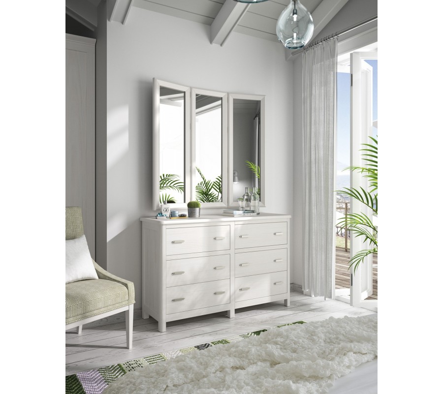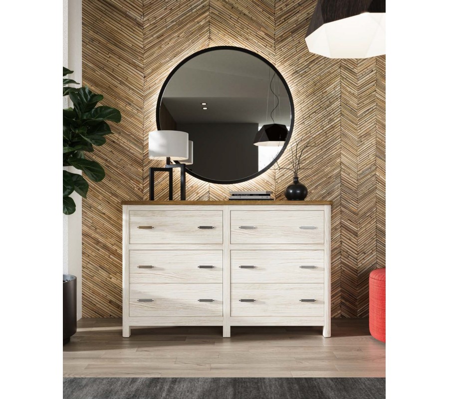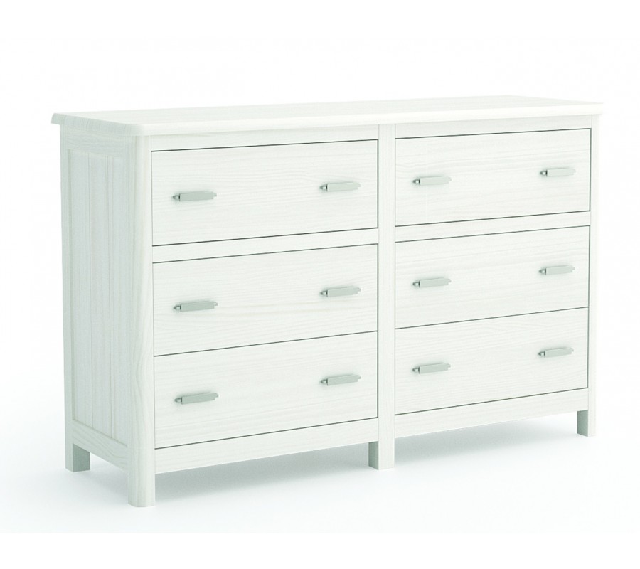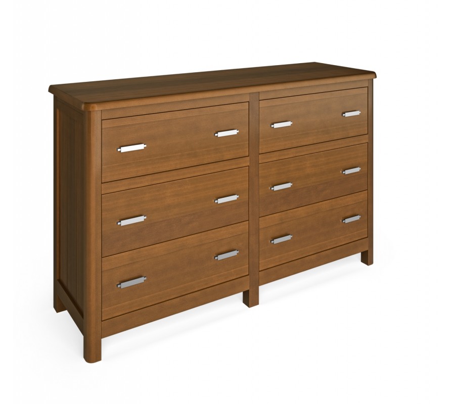 Komoda má mohutnou lineární siluetu a obsahuje úložný prostor organizovaný do šesti zásuvek, umístěných ve dvou sloupcích vedle sebe. Každou doplňují dvě úchyty z kovu, které mají jednoduchý plochý tvar. Vrchní zásuvky jsou odděleny od spodních lištou, což vytváří sofistikovaný dekorativní efekt.