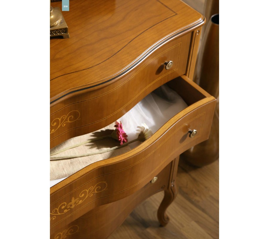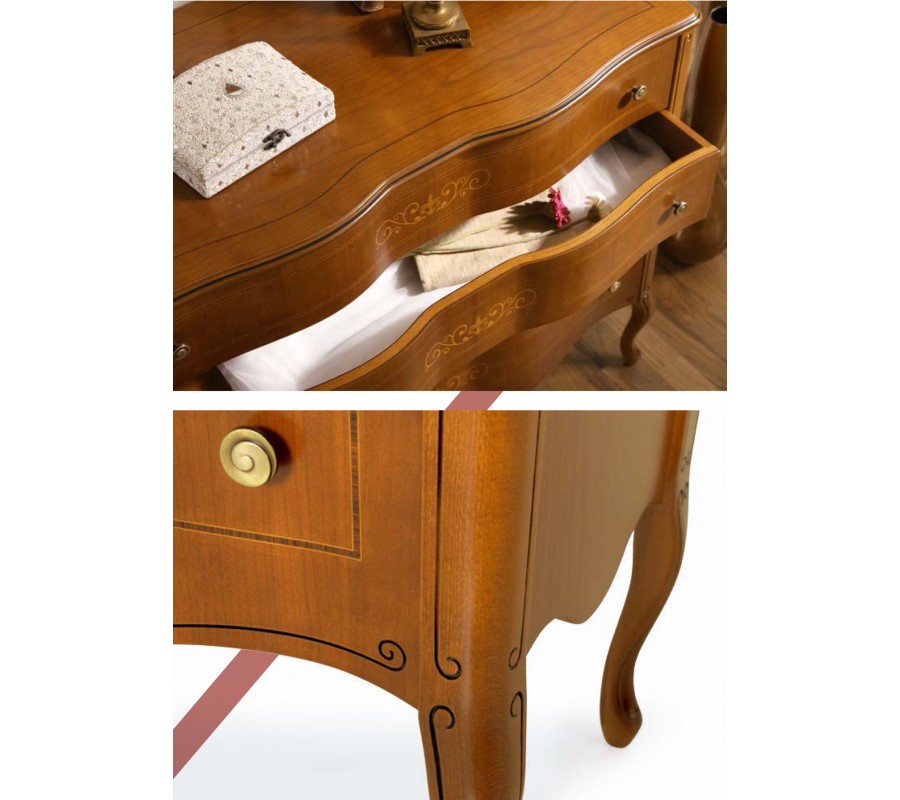Luxusní masivní komoda Rustica vnese do Vaší ložnice nádech elegance. Konstrukce komody je vyrobena z kvalitního bukového masivu a doplněna o vkusné, ručně vyřezávané ozdobné prvky, které jsou při barevném provedení Třešeň a Ořech zhotovené tradiční technikou Marketér. Stejně jako u celé kolekce Rustica, lze komodu vyhotovit ve více barevných provedeních dle vzorníku dřeva. Při šířce komody 100cm se hloubka komody mění na 50cm.