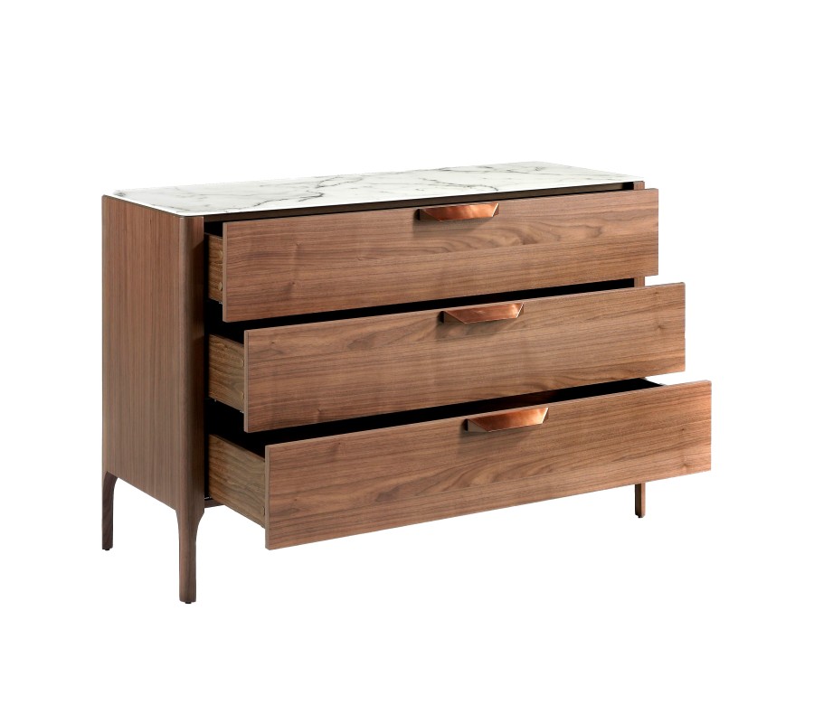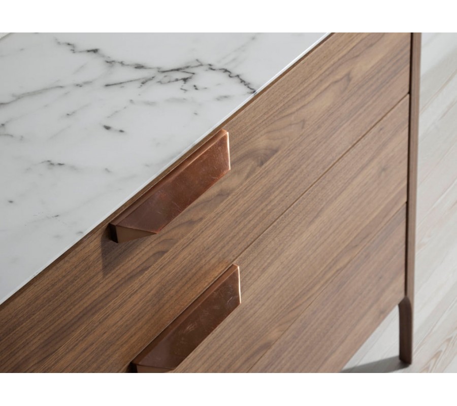 Vrchní deska je vyrobena z porcelánu a má exkluzivní design kalkatského mramoru. Tento materiál se vyznačuje hustou mléčnou bílou barvou s výraznými šedými žilami. V kombinaci s lesklou metalickou měděnou barvou úchytek komoda nabývá luxusního vzhledu.