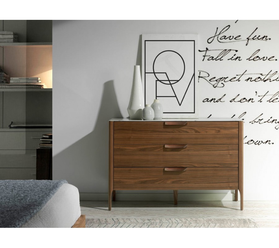 Silueta komody kombinuje striktní rovné linie a elegantní křivky. Hladké povrchy zdůrazňují čistou moderní estetiku a zaoblené hrany, plynule přecházející do nožiček, zdobí design minimalistickým způsobem. Ořechové dřevo přináší do kompozice naturální strukturu se subtilním vzorem letokruhů, což dodá místnosti teplý vizuální prvek.