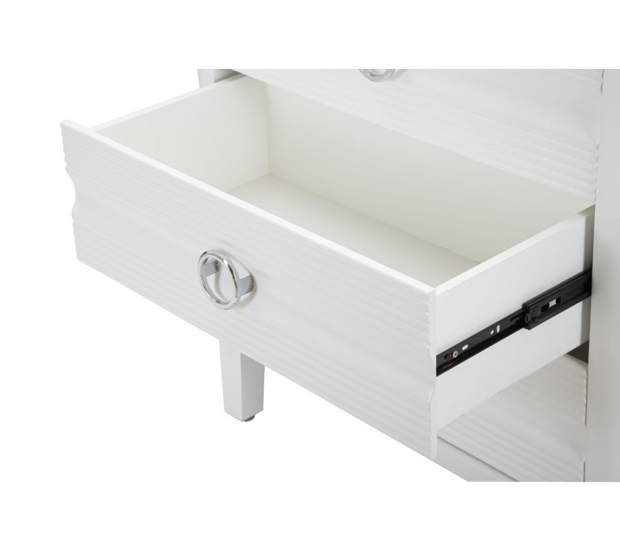 Komoda je vyrobena z kombinace masivního a dýhovaného dřeva. Povrch pokrývá vysoce lesklý nátěr v čisté bílé barvě, který prostor rozzáří. Výborně jej doplňuje lesklé chromové provedení úchytek na zásuvkách a kluzáků na nožičkách, které přinášejí do designu moderní akcent.