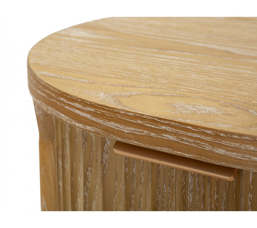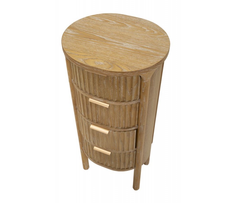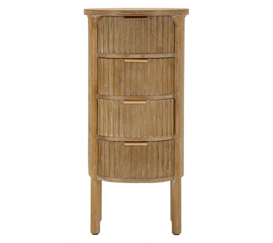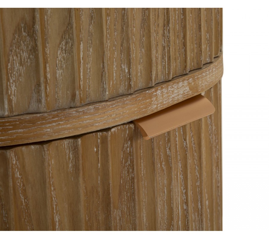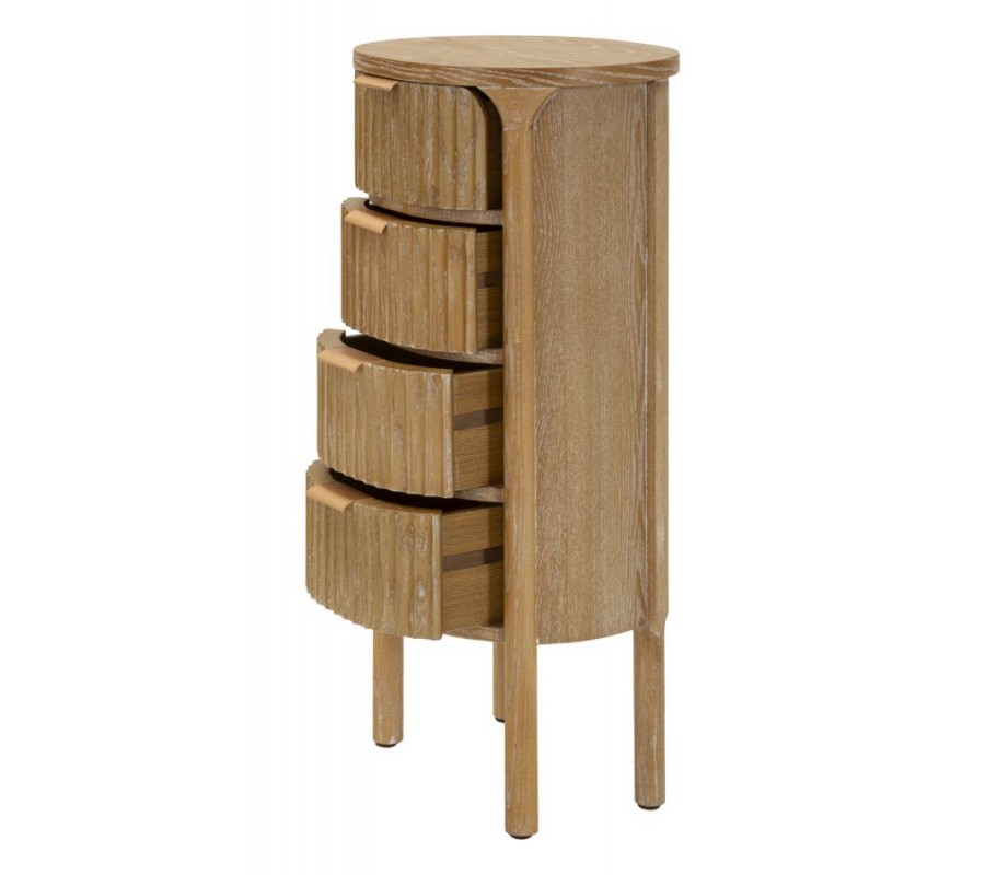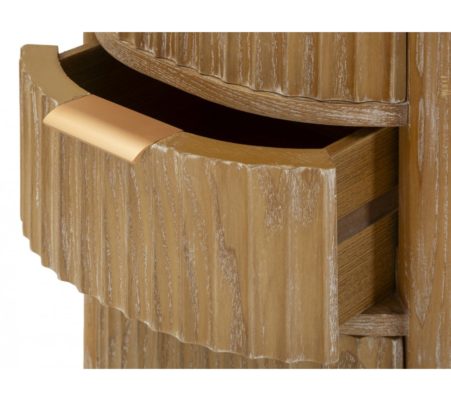 Komoda Meer v sobě spojuje eleganciart deco stylu a přirozenou krásu dřeva. Zásuvky jsou čtyři, každá z nich disponuje jemným vyřezávaným vertikálním vzorem, který připomíná přírodní vlnění nebo jemné žebrování. Povrch je v přírodním hnědém odstínu s patinovanou strukturou, která zvýrazňuje kresbu dřeva a působí autenticky a řemeslně. Korpus je v oválném tvaru s vintage nádechem.