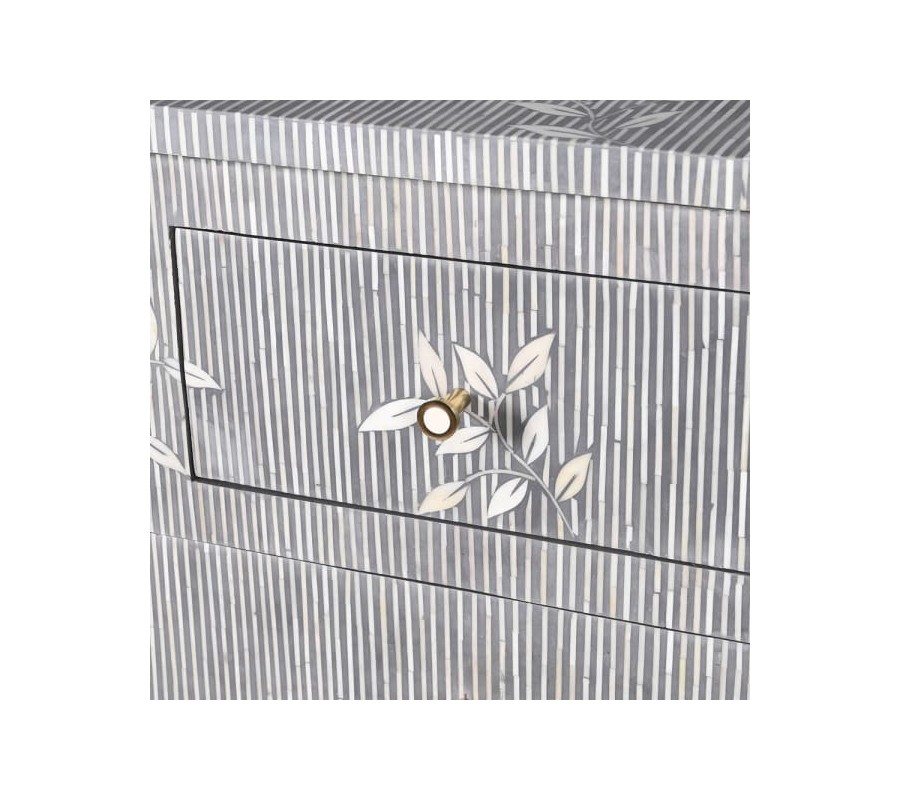 Komoda Liora je výjimečným kusem nábytku, ve kterém se pojí řemeslná tradice a umělecká preciznost. Její konstrukce je vyrobena z mangového dřeva, lakovaného do elegantního šedého odstínu, do kterého jsou ručně vsazeny drobné kousky kosti tvořící dekorativní kostěnou intarzi. Touto technikou vzniká jemný rostlinný motiv z listů a proužků, který se pravidelně opakuje na čelních i bočních stranách a vytváří sofistikovaný kontrast s šedým podkladem zdobeným vertikálními liniemi.