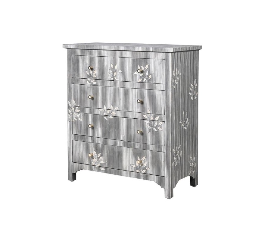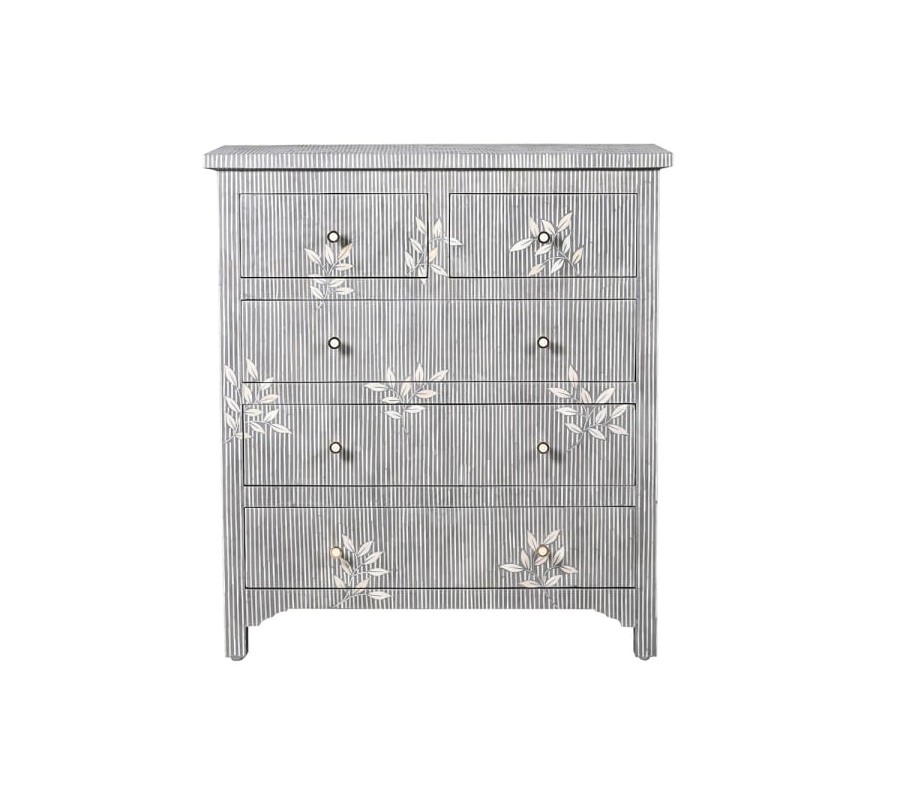 Luxusní orientální komoda Liora s intarzií z velbloudí kosti v šedo-bílé barvě s pěti zásuvkami s páskavým vzorem 106 cm