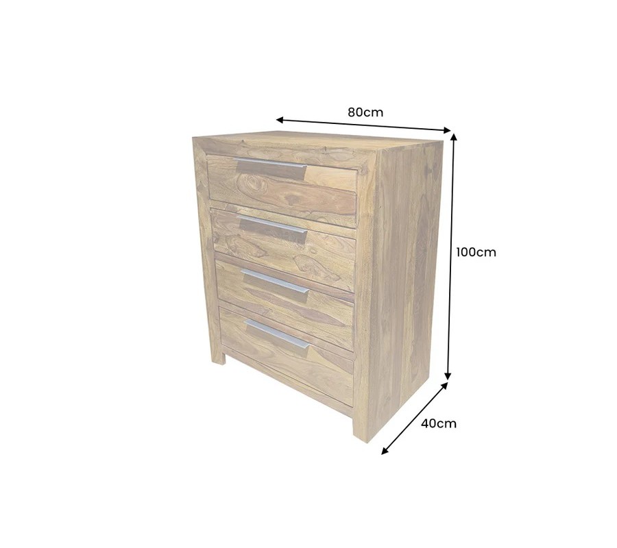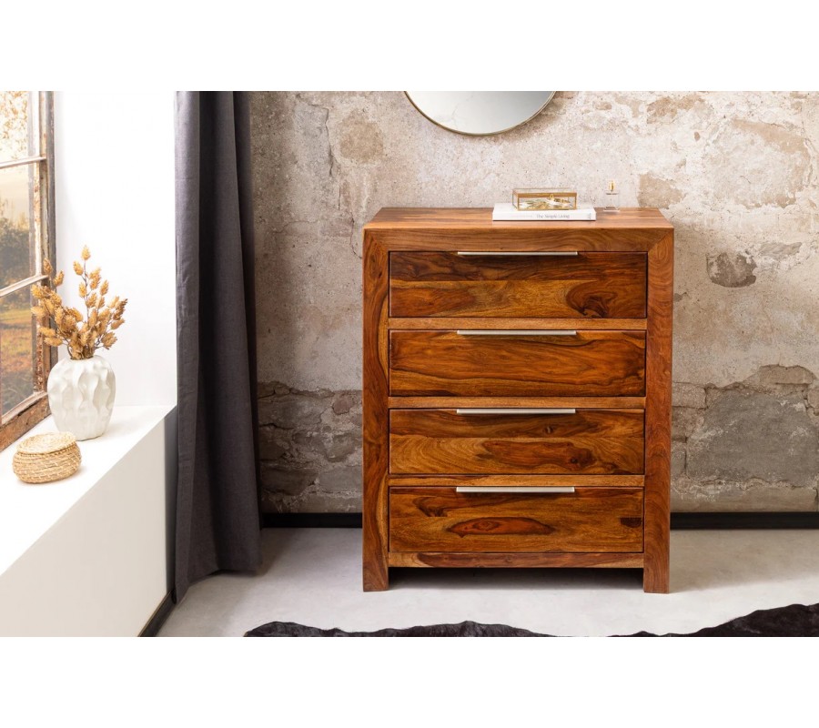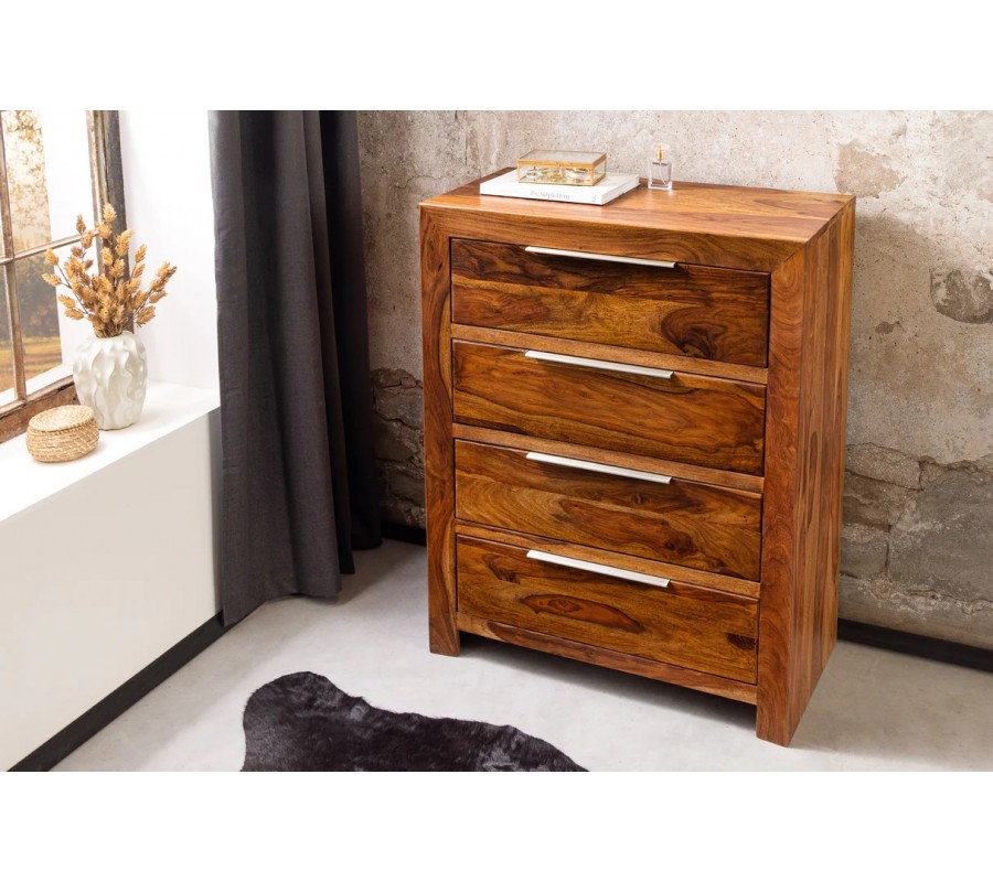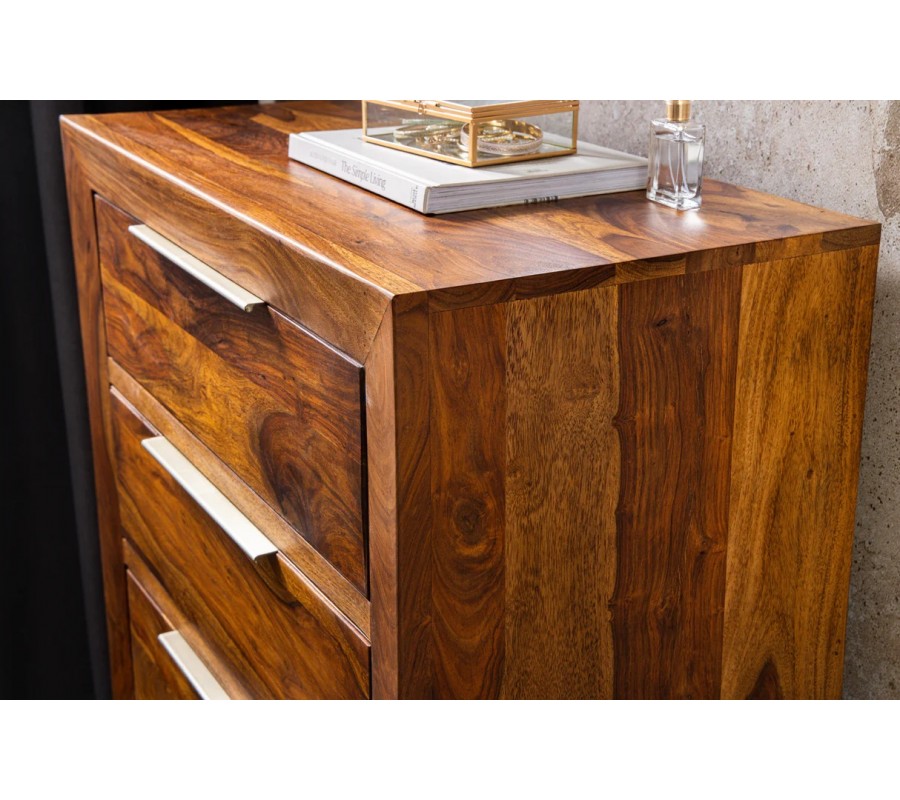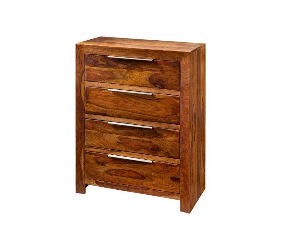Moderní masivní sheeshamová komoda Makassar v hnědé barvě se čtyřmi šuplíky se stříbrnými úchyty 100 cm