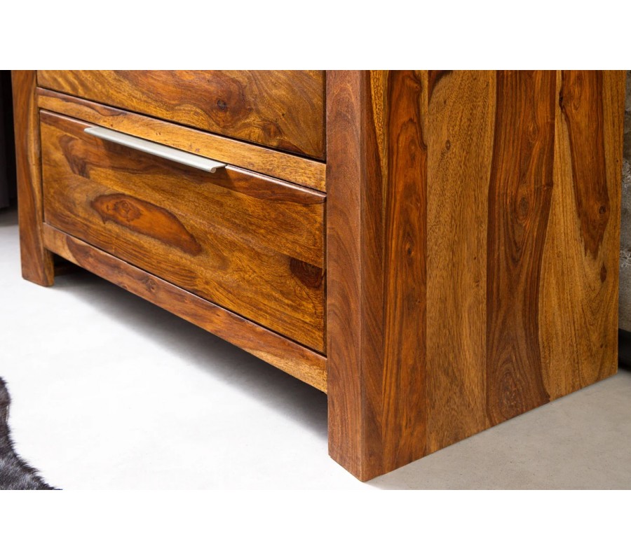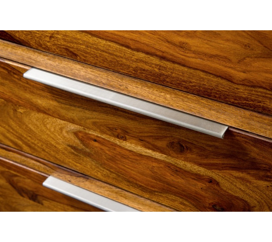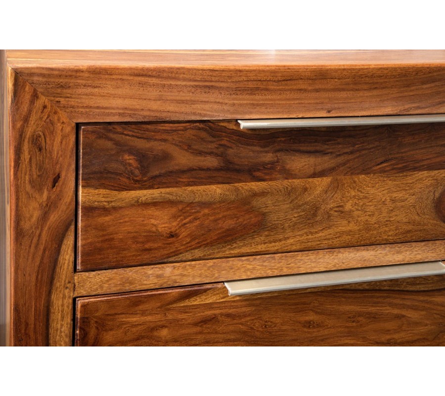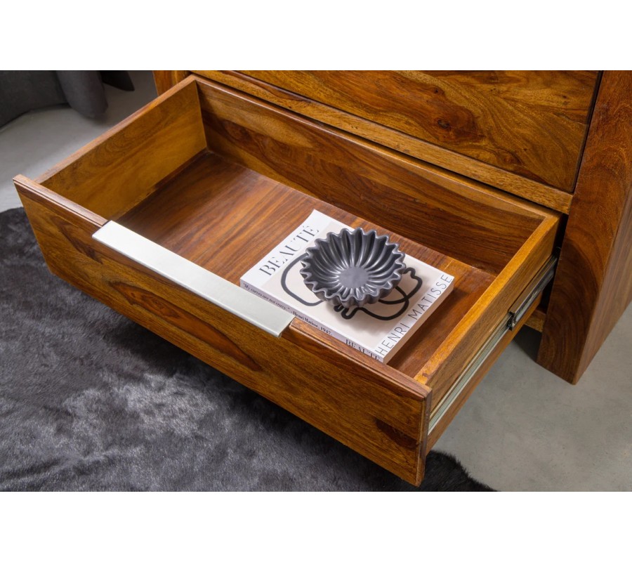 Komoda Makassar je moderným kusom nábytku, ktorý prirodzene spája autentickú krásu masívneho sheeshamového s čistým, nadčasovým dizajnom. Jej obdĺžnikový tvar a presné spracovanie dávajú vyniknúť bohatej kresbe dreva s výraznou štruktúrou letokruhov, vďaka čomu je každý kus originálom.
