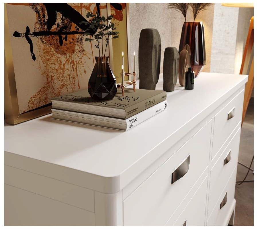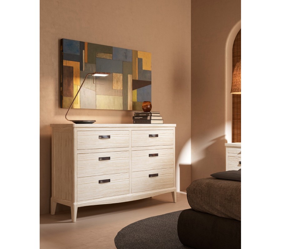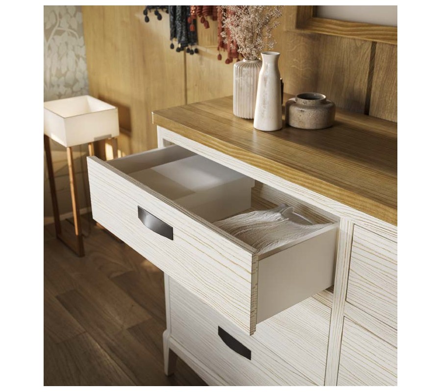 Úložný prostor tvoří šest zásuvek rozdělených do dvou sloupců, díky čemuž je organizace obsahu přehledná a praktická. Každá zásuvka je osazena kovovou úchytkou v jednoduchém obdélníkovém tvaru, která zajišťuje pohodlné otevírání a zároveň podtrhuje venkovský charakter kolekce Quebec. Nízké vyřezávané nožičky jsou z vnitřní strany jemně zkosené, díky čemuž komoda působí stabilně a zároveň opticky odlehčeně.