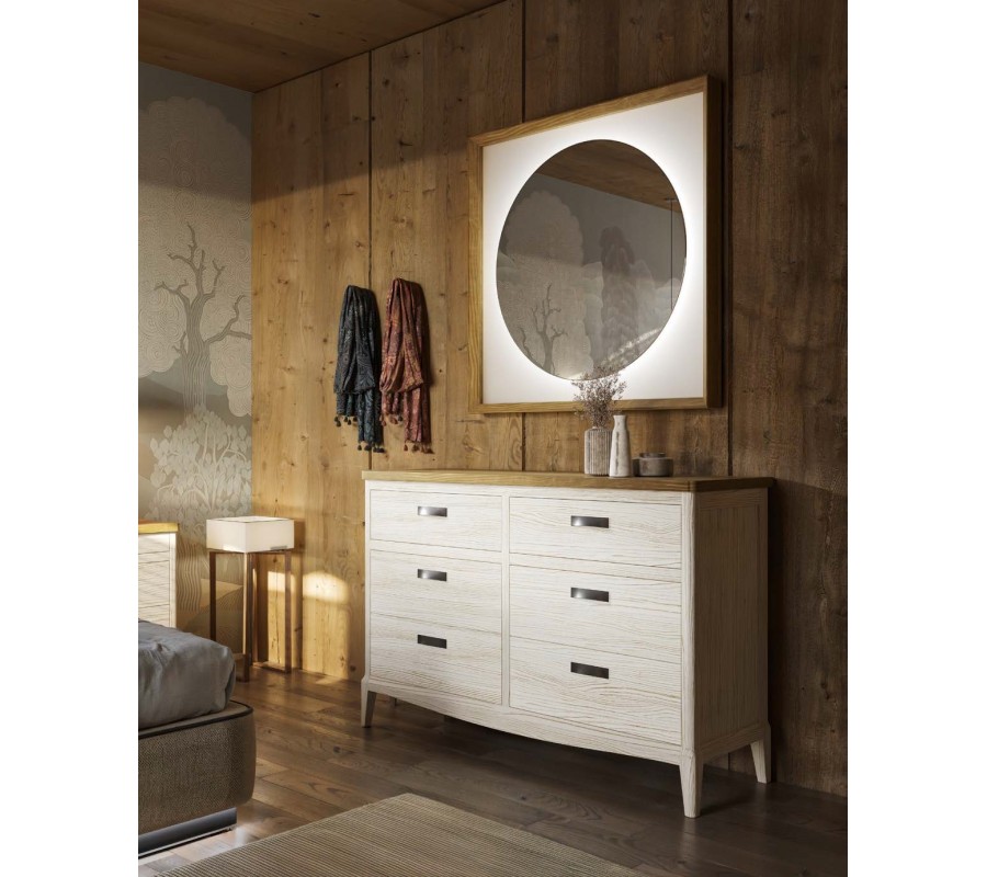 Luxusní venkovská komoda Quebec je elegantní úložný kus z masivního dřeva, který spojuje tradiční řemeslné zpracování s nadčasovým designem. Obdélníkové tělo je doplněno dekorativním obloukovým vyřezáváním ve spodní části, které zjemňuje siluetu a dodává komodě lehký, harmonický vzhled.