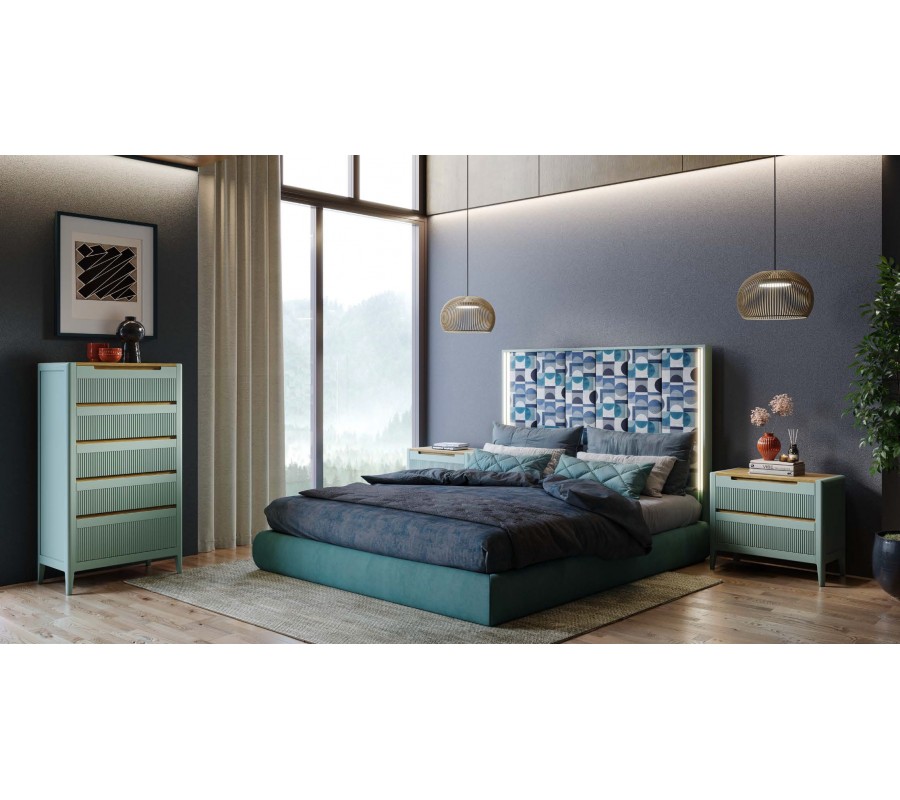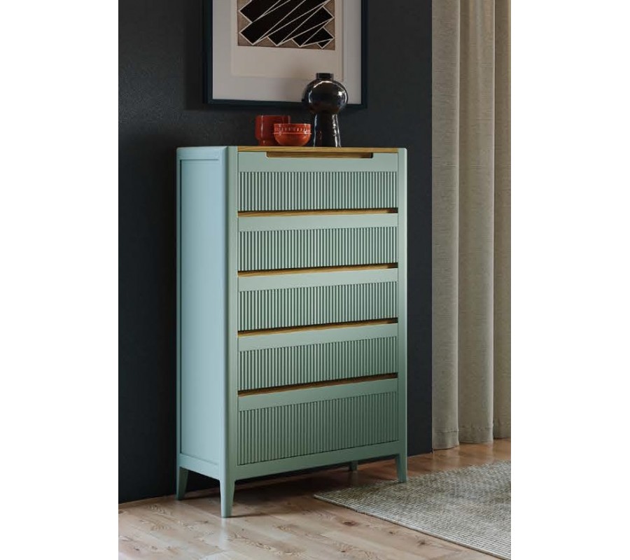 Komoda je vybavena pěti zásuvkami, přičemž spodní zásuvka má největší objem, což umožňuje praktické rozdělení úložného prostoru. Přední plochy všech zásuvek zdobí charakteristické vertikální vroubkování, které vytváří jemnou texturu. Otevírání je řešeno vyříznutou úchytkou pouze na vrchní zásuvce, integrovanou přímo do její čelní plochy, díky čemuž zůstává celkový design komody čistý a nerušený.