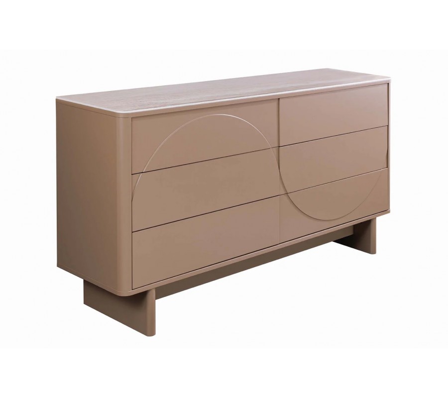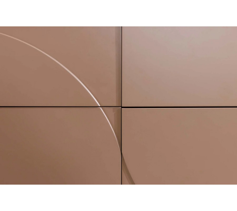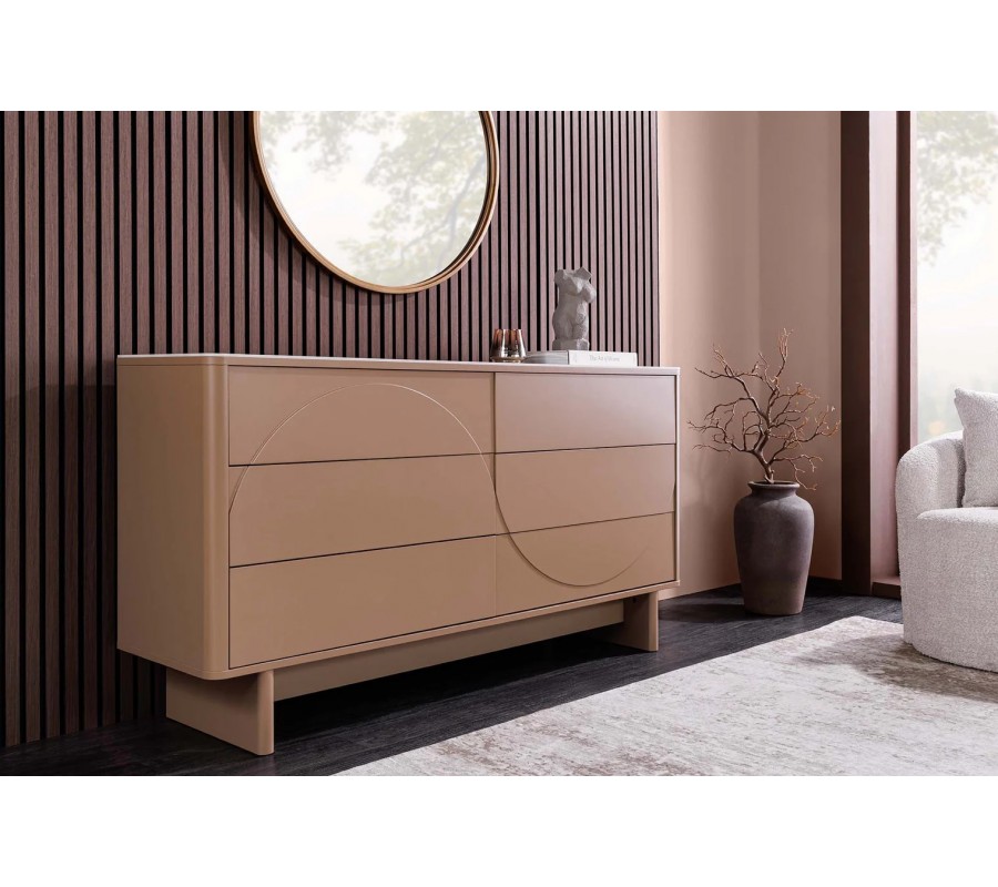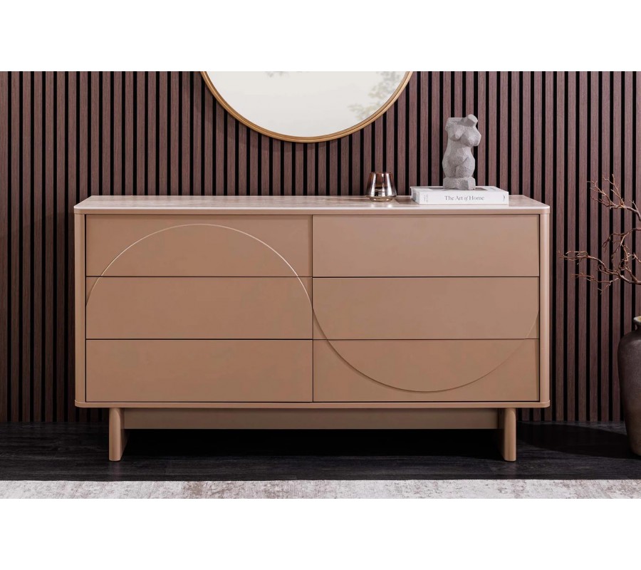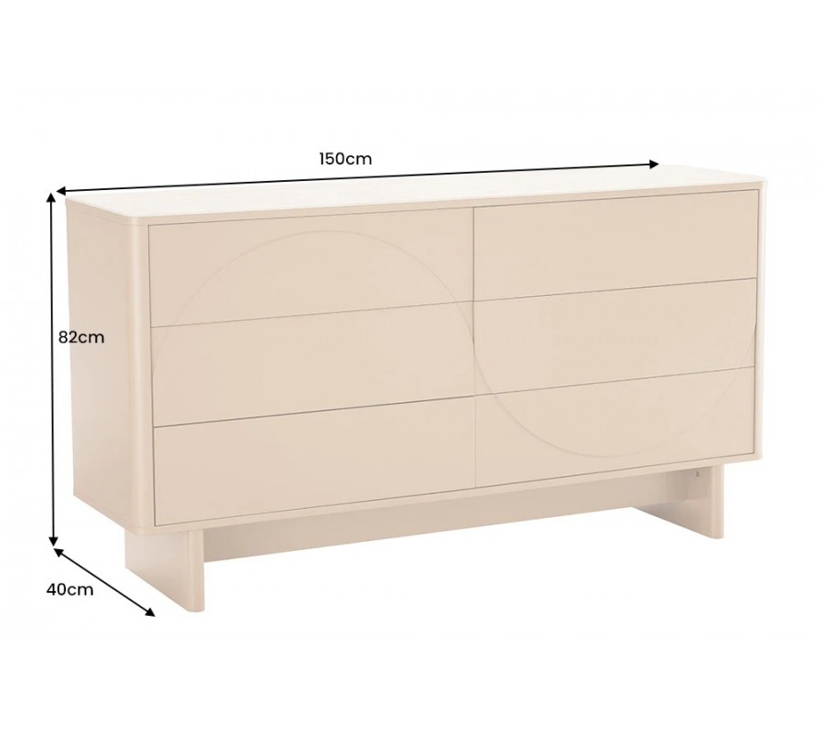 Komoda má široký obdélníkový tvar a obsahuje úložný prostor v podobě šest zásuvek, umístěných po dvojicích ve třech řadách. Mají hladkou fasádu bez úchytek, kterou zdobí minimalistický reliéf v podobě vlny složené ze dvou půloblouků. Jeho geometrický vizuál přináší do designu nádech art deco stylu a výborně se propojuje s čistými tvary nábytku.