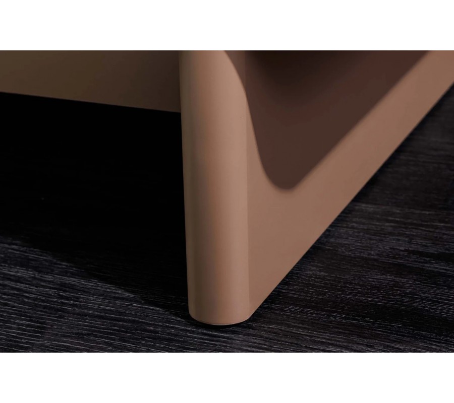 Vrchní deska je vyrobena z keramiky a má přírodní béžový design travertinu, který krásně koresponduje se světlým hnědým lakováním. Její obdélníkový tvar je zjemněn zaoblenými rohy, což se promítá i do profilu předních svislých stran. Dvě nožičky mají plochý obdélníkový tvar se zaoblenými hranami a jsou navzájem propojeny lineární výztuhou. Jsou vyšší, což odlehčuje celkový vizuál komody.