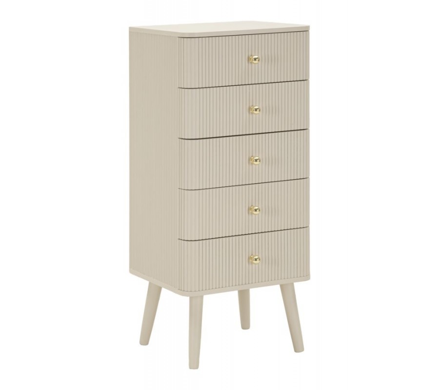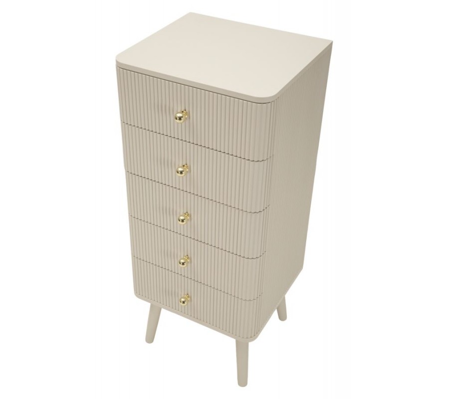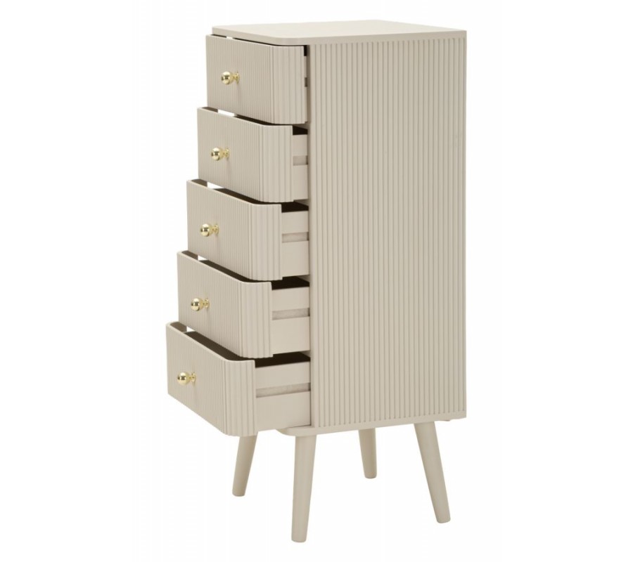Art deco vysoká béžová komoda Shelly s pěti zásuvkami se zlatými úchyty a žebrovaným reliéfním zdobením 89 cm