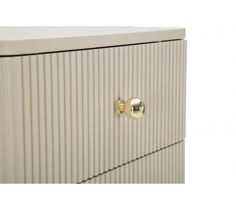 Přední a boční strany zdobí vertikální žebrovaný reliéf, který dodává komodě exkluzivní art deco výraz. Tuto estetiku doplňují také kulaté úchytky v lesklém zlatém kovovém provedení. Přední hrany jsou zaoblené, což zjemňuje celkový tvar a dodává mu eleganci.