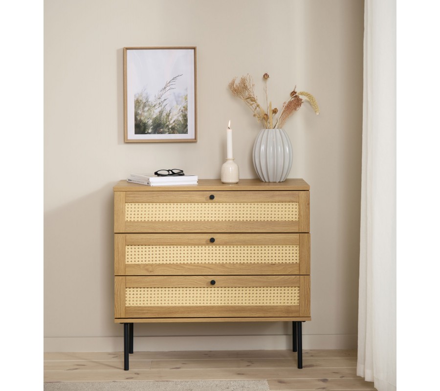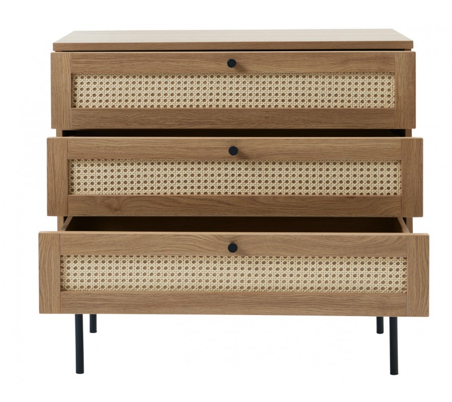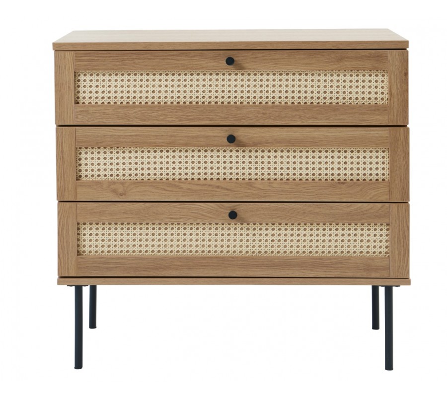 Moderní komoda Malmo ve světle hnědé dubové barvě se třemi šuplíky s ratanovým výpletem a černýma nohama 80 cm