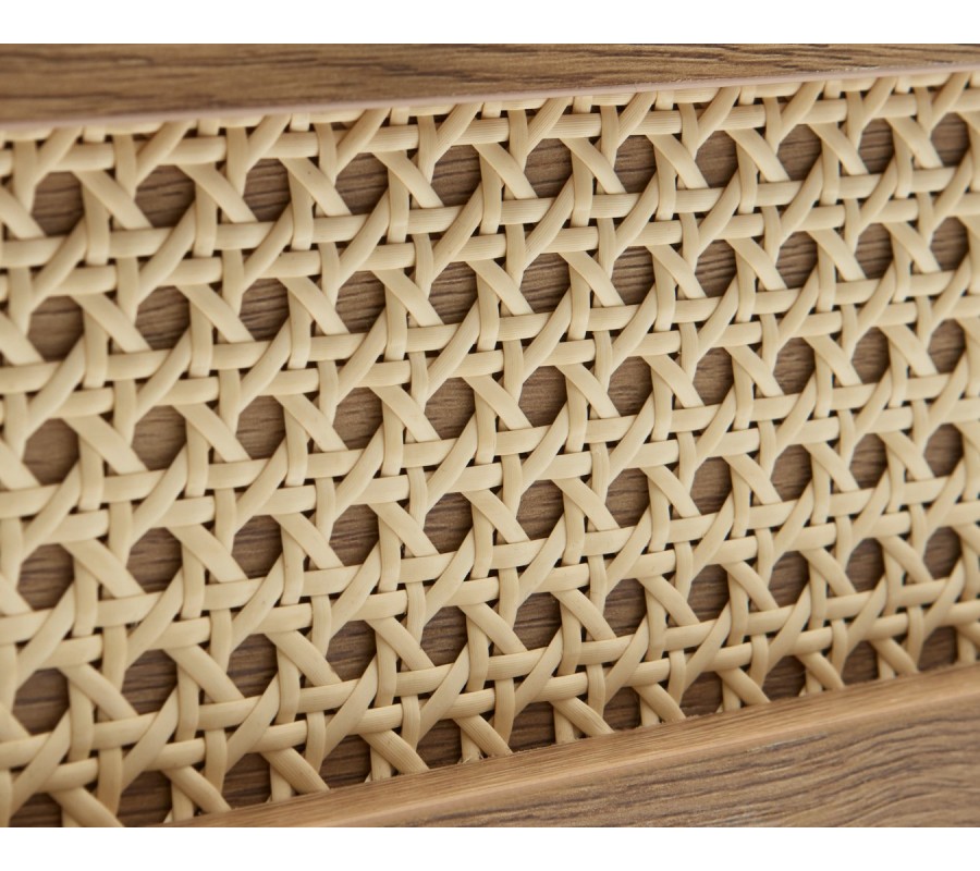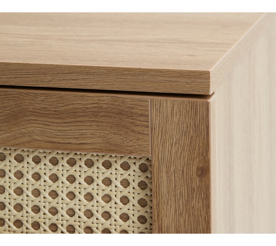 Korpus je vyroben z kvalitní MDF s odolnou melaminovou povrchovou úpravou ve světlém hnědém dubovém dekoru s pravidelnou estetickou kresbou dřeva. Tento teplý přírodní tón harmonicky doplňuje béžový ratan. Kontrastní prvek přinášejí černé kovové detaily v podobě úchytek a podstavy, které dodávají komodě moderní industriální nádech.