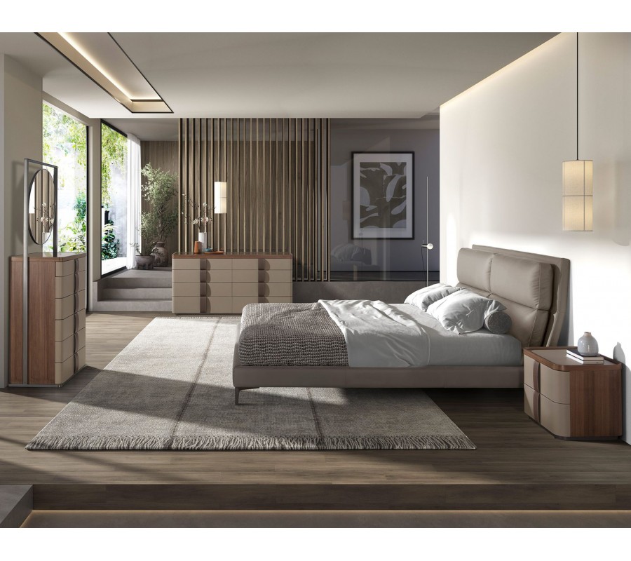 Luxusní moderní sestava nábytku do ložnice Charmoin s ořechovým hnědým dřevem a béžově kůží
