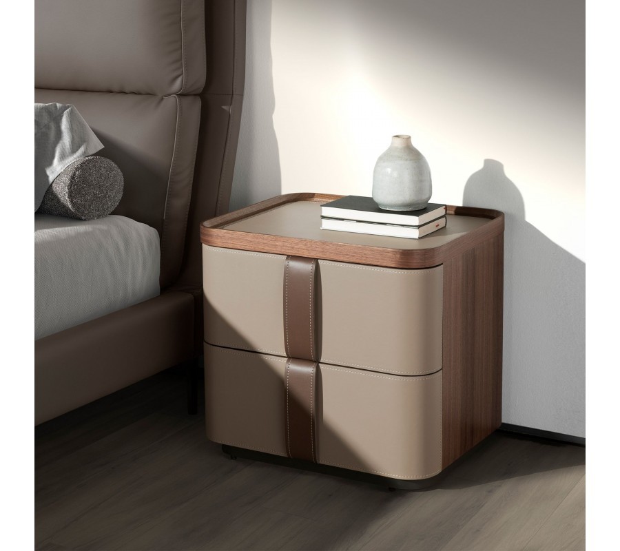 Středobodem sestavy je čalouněná manželská postel s mohutným čelem ve světlém norkově béžovém odstínu. Skvěle ji doplňují úložné prostory s potahem z pravé kůže ve světlé béžové barvě, která vytváří tónovou variaci v prostoru. Další akcent přichází v podobě tmavšího hnědého provedení kožených úchytek. Ořechové hnědé dřevo podtrhuje naturální vizuál a detaily z nerezavějící oceli zase přinášejí dotek moderního stylu.