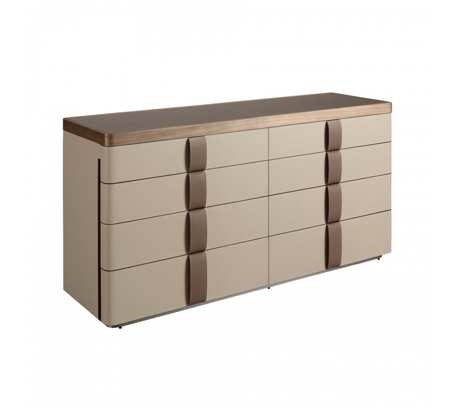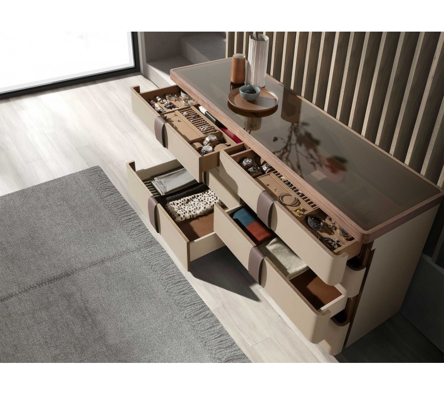 Noční stolek a široká nízký komoda poskytují bohaté místo pro uskladnění textilií či osobních předmětů. Vyšší komoda je doplněna o kulaté zrcadlo a tento unikátní doplněk z ní činí nejen praktický, ale také designově zajímavý prvek. Úložné prostory mají elegantní siluety, kombinující rovné linie s půvabnými křivkami, které vytvoří v prostoru pocit plynulosti.