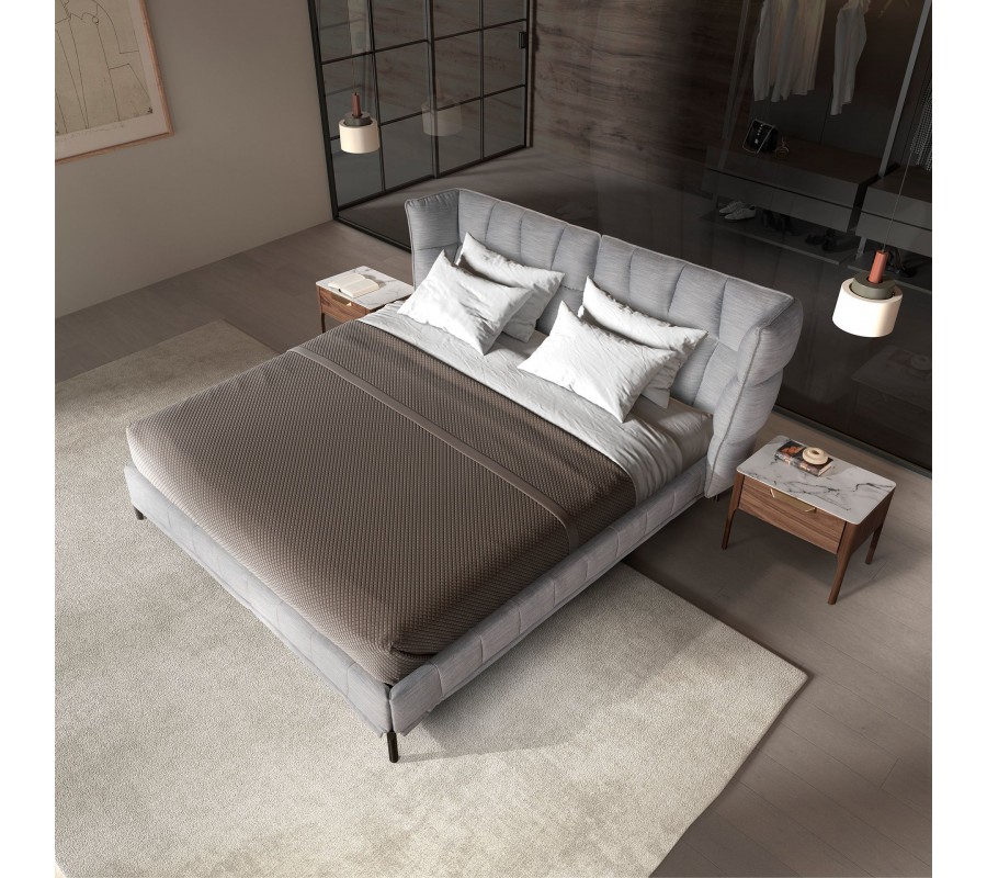 Místnosti dominuje čalouněná manželská postel s mohutným čelem, která poskytne maximální komfort. Prošívání ve stylu capitone zdůrazňuje její měkkost a světlá modrá barva potahu přináší do kompozice svěží akcent. Výborně se propojuje s růžově měděnou barvou úchytek úložných prostor a s bílými tóny mramoru. Tuto sofistikovanou kombinaci materiálů doplňuje dýhované ořechové dřevo v teplém hnědém odstínu, které přináší do tohoto konceptu dotek přírody.