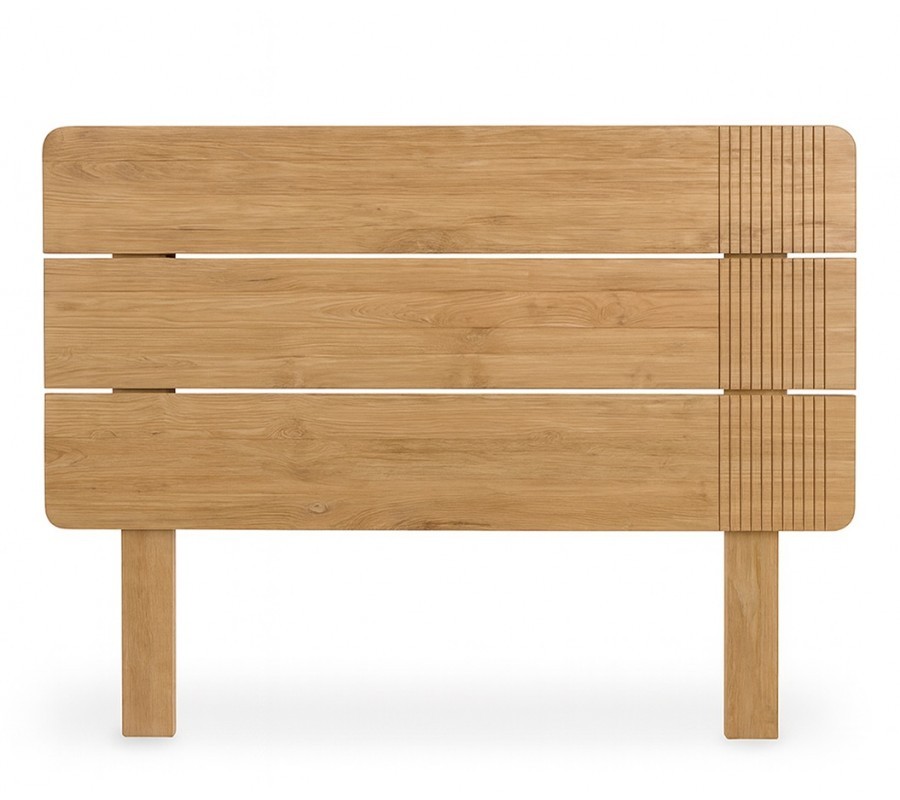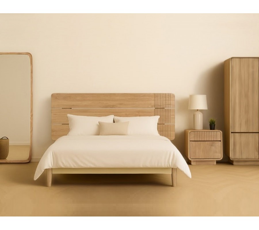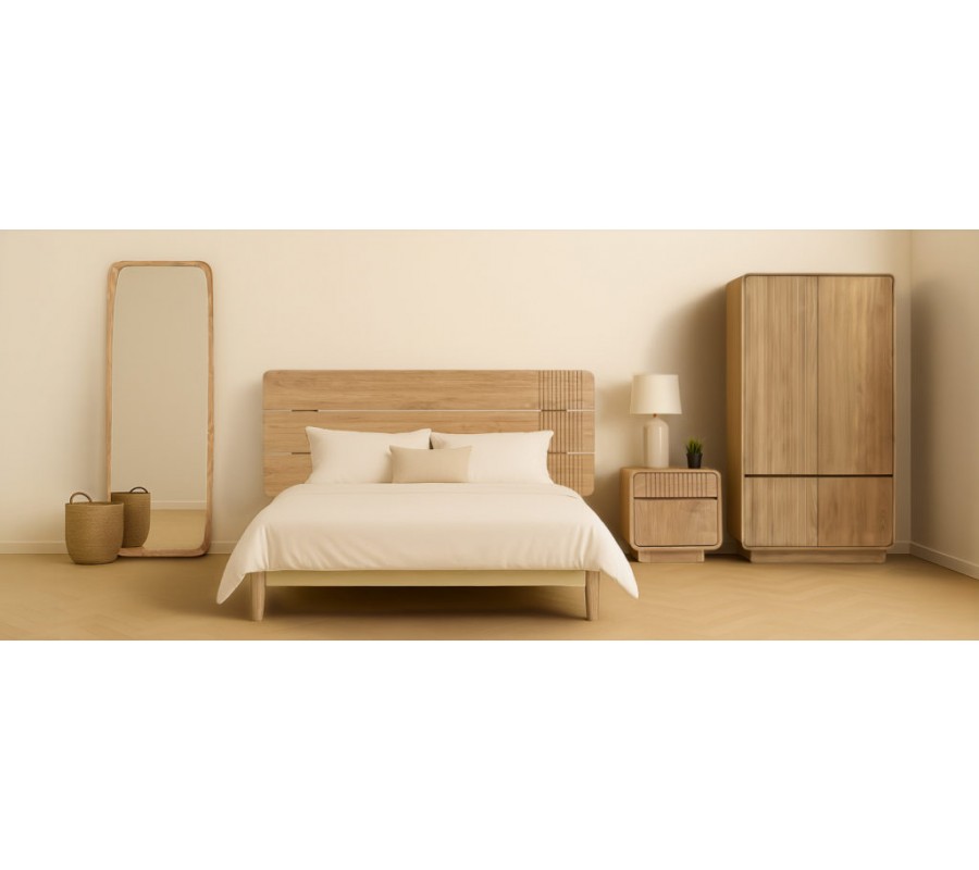 Luxusní retro ložnicová sestava Riga z masivního teakového dřeva ve světle hnědé barvě s minimalistickým lineárním zdobením
